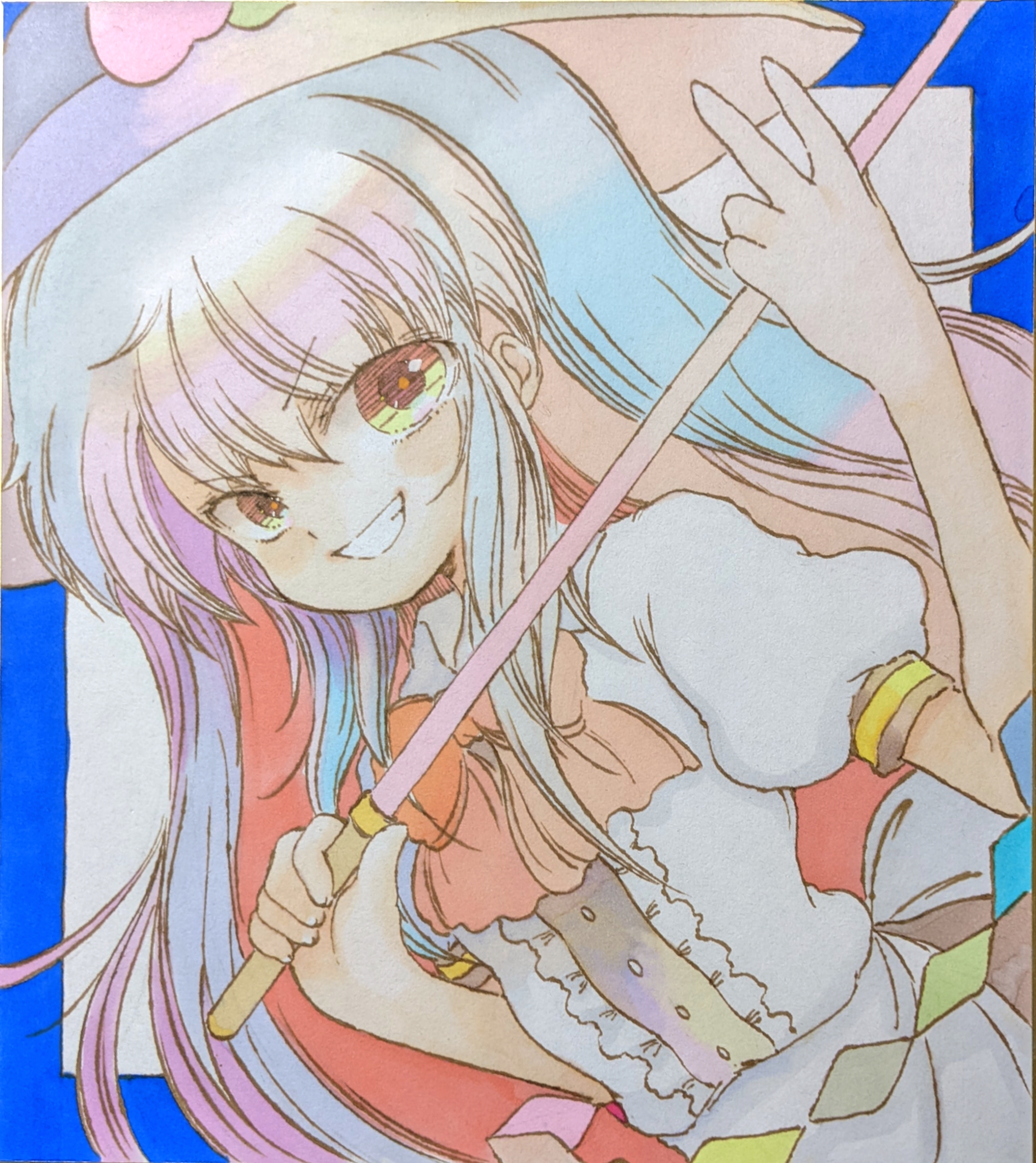 1girl absurdres blue_border blue_hair border bow bowtie center_frills commentary_request frills hat highres hinanawi_tenshi holding holding_sword holding_weapon long_hair marker_(medium) nishina_masato puffy_short_sleeves puffy_sleeves rainbow_order red_bow red_bowtie short_sleeves solo sword touhou traditional_media upper_body weapon