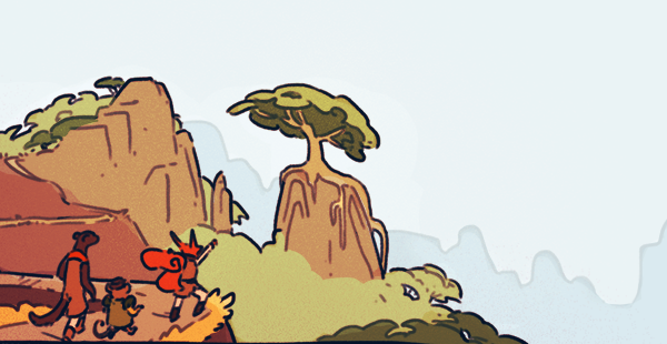 1boy 2girls blue_sky brown_fur brown_tunic cliff commentary day english_commentary fantasy forest fox from_behind furry mellific mountain mouse_(animal) multiple_girls nature orange_fur original outdoors path pointing road sky tail tree tunic walking weasel