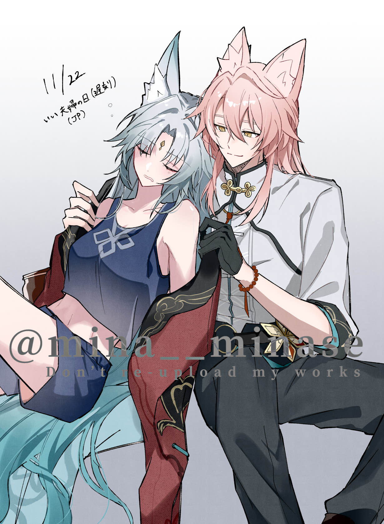 1boy 1girl alternate_costume animal_ears black_gloves chinese_clothes closed_eyes closed_mouth couple feixiao_(honkai:_star_rail) fox_ears fox_girl fox_tail gloves hetero highres honkai:_star_rail honkai_(series) jiaoqiu_(honkai:_star_rail) long_hair midriff mina_minase pants pink_hair short_hair shorts simple_background sitting smile tail undressing
