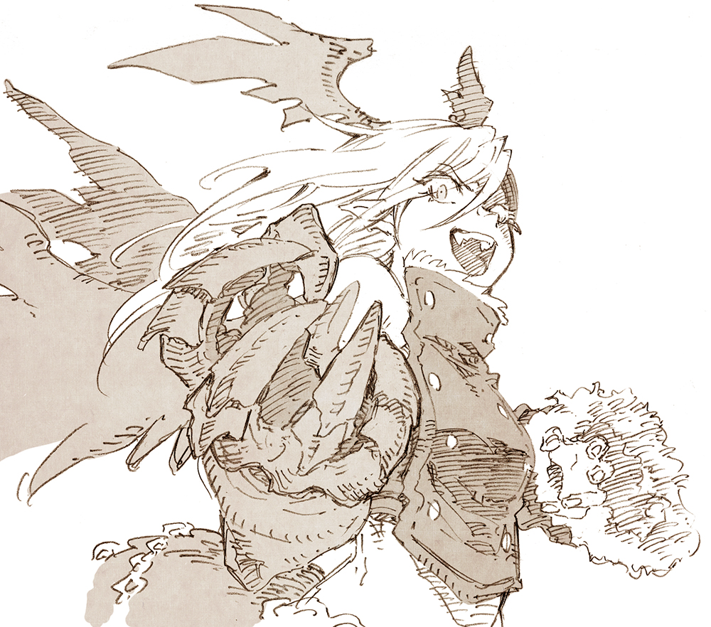 1girl abara_heiki armor bare_shoulders breastplate clawed_gauntlets dragon_girl dragon_horns dragon_wings eyes_visible_through_hair fang fighting_stance foreshortening fur_trim gauntlets hair_between_eyes head_wings horns kaya_(princess_connect!) long_hair looking_to_the_side monochrome monster_girl open_mouth outstretched_arm pointy_ears princess_connect! single_gauntlet smile solo teeth upper_teeth_only weapon wings