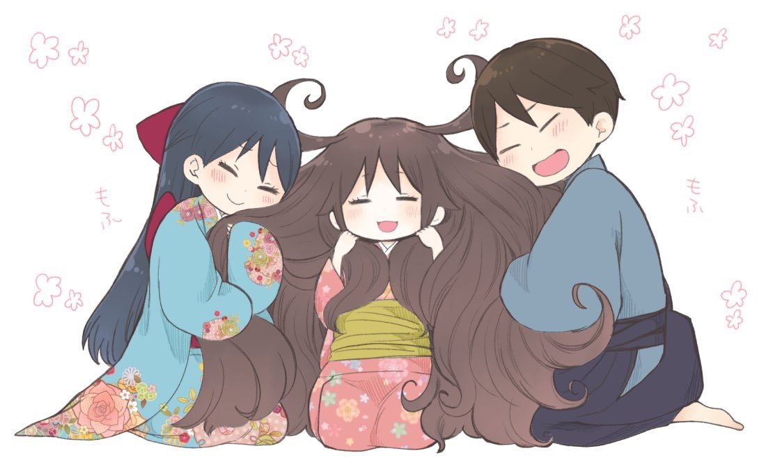 1boy 2girls blue_hakama blue_kimono blush brother_and_sister closed_eyes closed_mouth commentary_request facing_viewer floral_background floral_print floral_print_kimono hair_ribbon hakama holding_another's_hair japanese_clothes kimono long_hair multiple_girls obi open_mouth pink_kimono print_kimono red_ribbon ribbon sana_(memechi) sash seiza shima_tamahiko shima_tamako short_hair siblings sitting smile tachibana_yuzuki taishou_otome_otogibanashi very_long_hair white_background yellow_sash