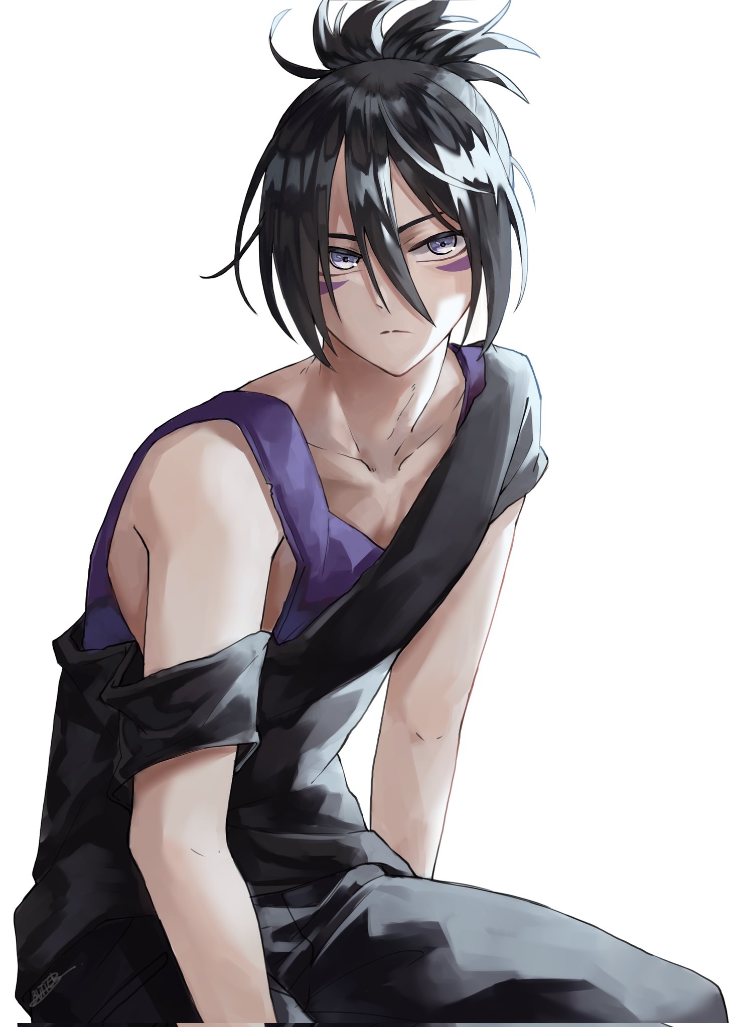 1boy :/ black_hair black_pants black_shirt closed_mouth collarbone commentary_request facial_mark grey_eyes hair_between_eyes hair_up highres korean_commentary looking_to_the_side male_focus one-punch_man onsoku_no_sonic pants purple_tank_top shirt short_sleeves sideways_glance simple_background single_bare_shoulder single_off_shoulder sitting tank_top white_background wolf6481