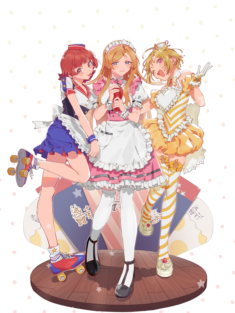 >:) >:p 3girls ;d ahoge apron blonde_hair blue_eyes blue_skirt bottle burger_skater_(idolmaster) dress flipped_hair frilled_skirt frills gloves hair_flaps hat heart_apron highres holding holding_bottle hoyaza1561 ibuki_tsubasa idolmaster idolmaster_million_live! idolmaster_million_live!_theater_days long_hair maid_apron maid_headdress multiple_girls nonohara_akane official_alternate_costume one_eye_closed open_mouth pink_dress pink_eyes pretty_waitress_(idolmaster) puffy_short_sleeves puffy_sleeves red_eyes red_hair roller_skates shinomiya_karen shirt short_hair short_sleeves skates skirt smile striped_clothes striped_dress striped_thighhighs teatime_happiness_(idolmaster) thighhighs underbust v-shaped_eyebrows very_long_hair white_shirt wooden_floor yellow_dress