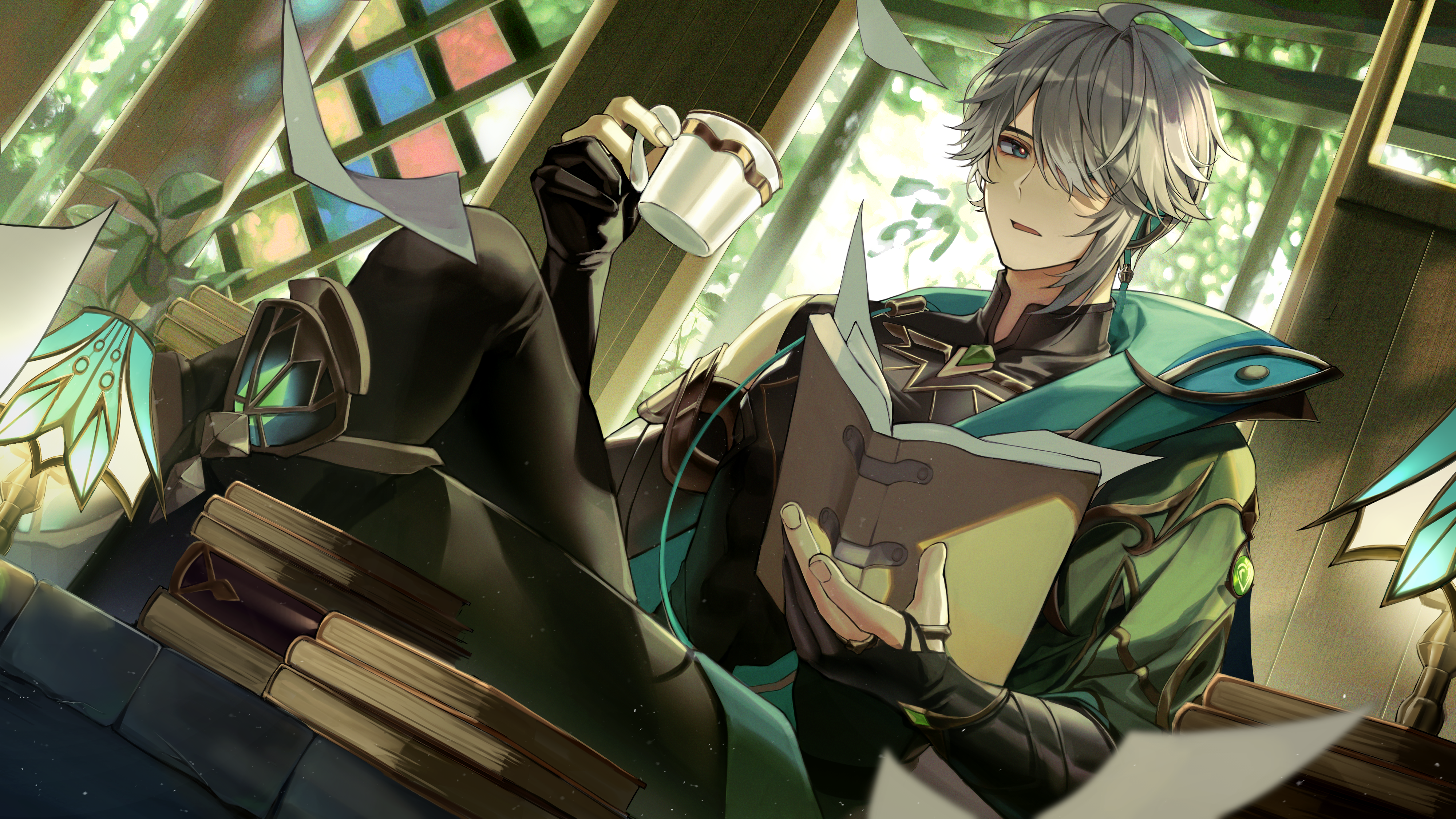 1boy absurdres ahoge alhaitham_(genshin_impact) aqua_eyes black_gloves book book_stack cape commentary_request crossed_legs cup fingernails gem genshin_impact gloves green_gem grey_hair hair_over_one_eye highres holding holding_book holding_cup indoors lamp looking_to_the_side male_focus parted_lips partially_fingerless_gloves short_hair sitting solcha solo swept_bangs tree vision_(genshin_impact)