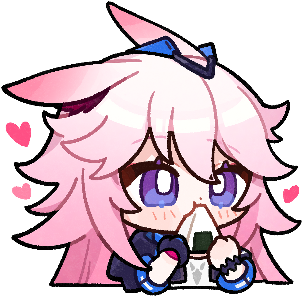 animal_ears black_gloves chibi chibi_only eating food food_in_mouth fox_ears fox_girl gloves heart honkai_(series) honkai_impact_3rd long_hair official_art onigiri pink_hair purple_eyes shirt single_glove solo upper_body white_background white_shirt yae_sakura yae_sakura_(goushinnso_memento)