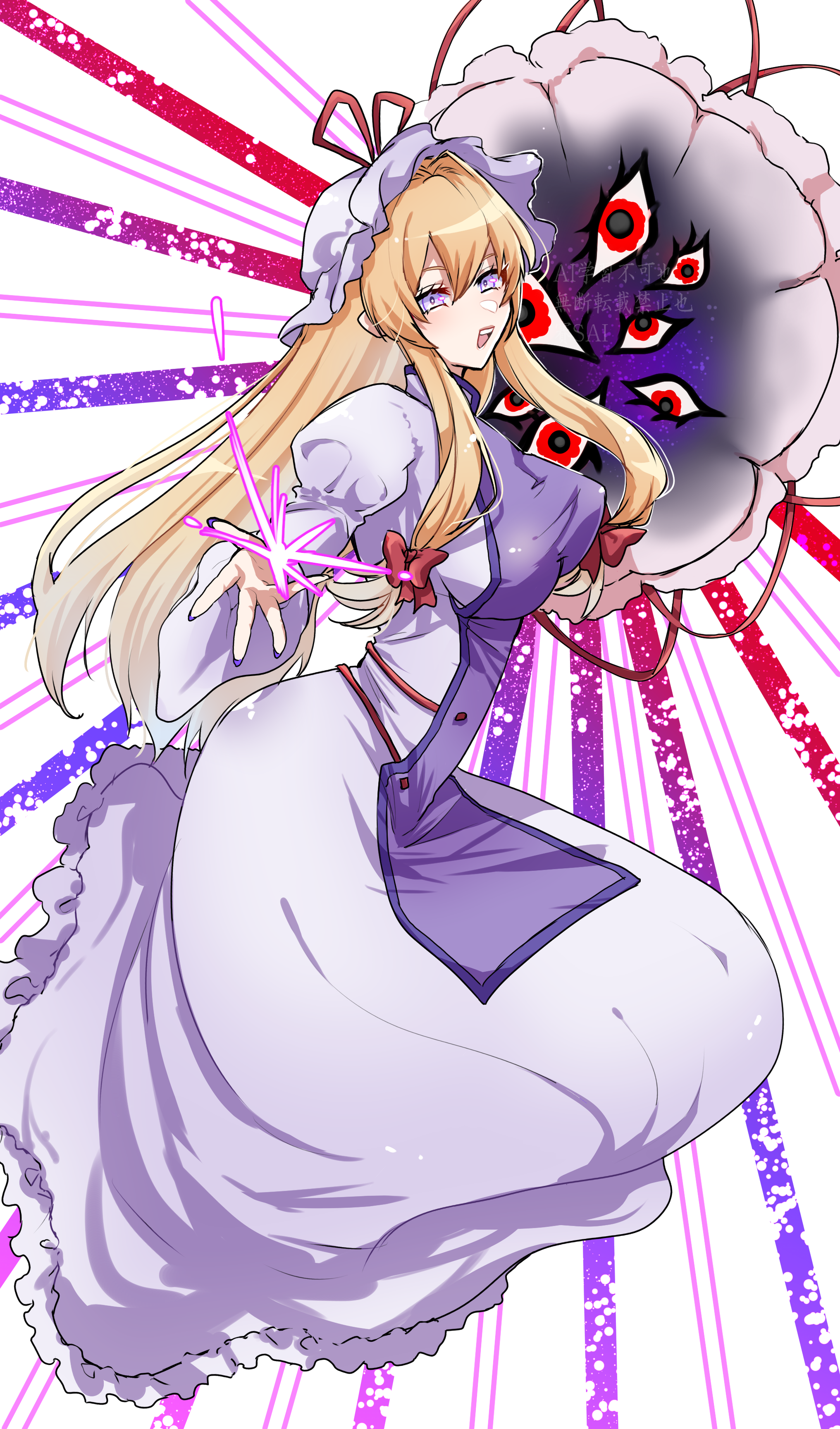 1girl absurdres blonde_hair breasts commentary dress ellen_drawing gap_(touhou) hair_ribbon hat highres large_breasts long_hair long_sleeves mob_cap nail_polish purple_eyes purple_tabard ribbon tabard touhou umbrella watermark white_dress yakumo_yukari