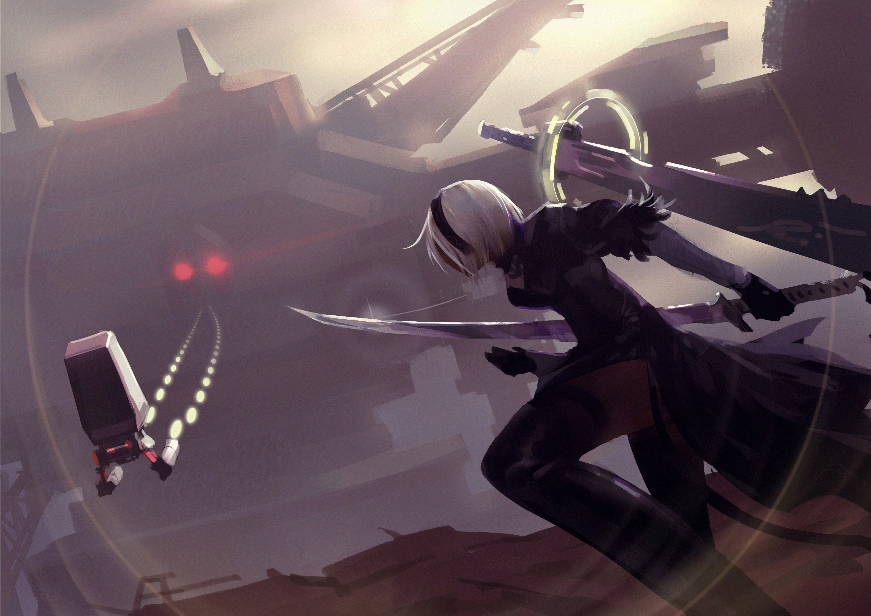 1girl 2b_(nier:automata) absurdres black_dress black_hairband black_thighhighs boots breasts clothing_cutout dress dutch_angle feather-trimmed_sleeves feather_trim fighting_stance from_behind gloves glowing glowing_eyes hairband highres holding holding_sword holding_weapon juliet_sleeves long_sleeves nier:automata nier_(series) pod_(nier:automata) puffy_sleeves red_eyes robot short_hair solo standing sword thighhighs thighhighs_under_boots thighs virtuous_contract weapon white_hair wolisu
