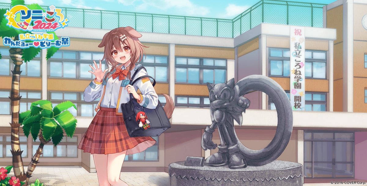 1girl :d animal_ears bag black_bag blue_sky blush bone_hair_ornament bow bowtie braid brown_eyes brown_hair character_charm charm_(object) cloud cloudy_sky collared_shirt company_name copyright_notice cowboy_shot day dog_ears dog_girl dog_tail door double-parted_bangs dress_shirt fingernails fukahire_(ruinon) hair_between_eyes hair_ornament hair_tie hand_up holding_strap hololive inugami_korone jacket knuckles_the_echidna logo long_hair looking_at_viewer low_twin_braids miniskirt official_art open_clothes open_hand open_jacket open_mouth orange_bow orange_bowtie orange_skirt outdoors plaid_clothes plaid_skirt pleated_skirt school school_bag school_uniform second-party_source segagaga shirt shirt_tucked_in skirt sky smile solo sonic_(series) sonic_the_hedgehog spread_fingers statue tail teeth translation_request tree twin_braids upper_teeth_only virtual_youtuber waving white_jacket white_shirt window
