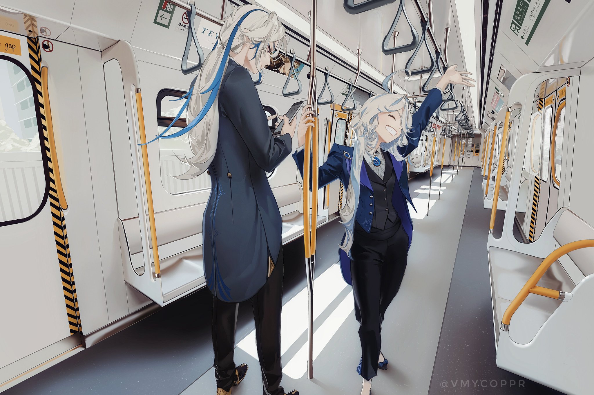 1boy 1girl black_footwear black_pants coppr furina_(genshin_impact) genshin_impact highres neuvillette_(genshin_impact) non-web_source pants subway train_interior white_hair