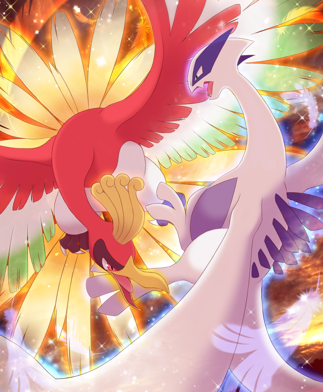 bird black_eyes commentary feathers gen_2_pokemon highres ho-oh legendary_pokemon lugia maiko_(mimi) nintendo no_humans open_mouth pokemon pokemon_(creature) rainbow_feather_(pokemon) red_eyes silver_feather_(pokemon) wings