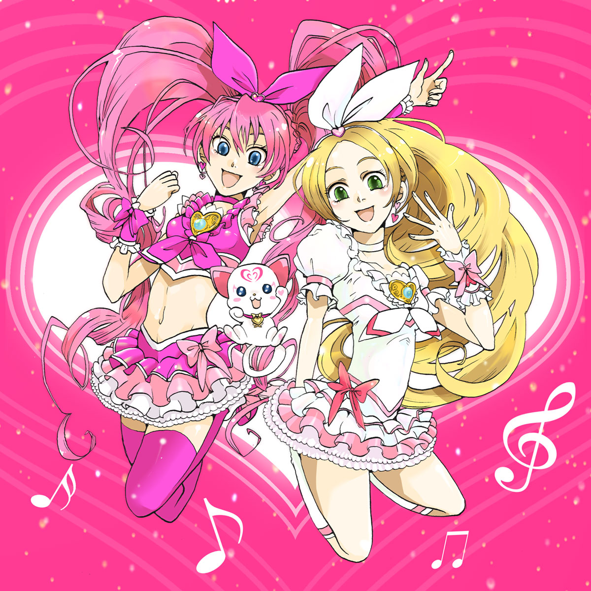 10s 2girls :3 :d :p beamed_quavers blonde_hair blue_eyes boots bow brooch cat choker cure_melody cure_rhythm curly_hair earrings eyelashes frills full_body green_eyes hair_ribbon happy heart highres houjou_hibiki hummy_(precure) jewelry long_hair magical_girl mascot midriff minamino_kanade multiple_girls musical_note navel open_mouth pink_background pink_bow pink_hair pink_legwear precure quaver ribbon skirt smile suite_precure thighhighs tihori-t tongue tongue_out treble_clef twintails white_choker wrist_cuffs