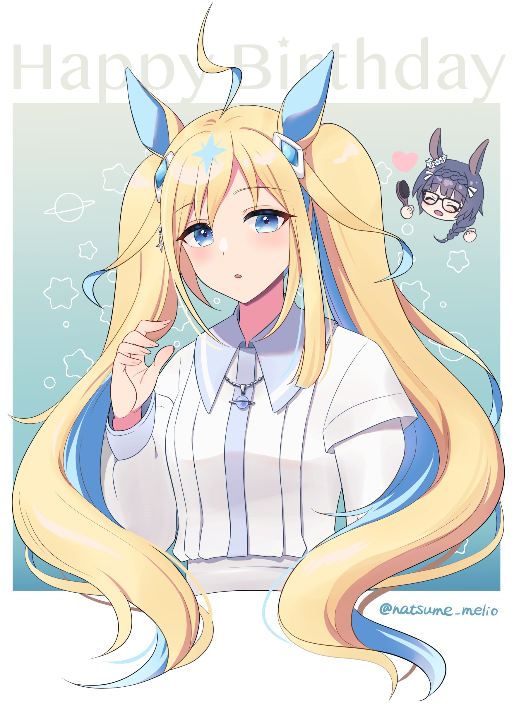 2girls absurdres ahoge animal_ears blonde_hair blue_eyes blue_hair blush braid closed_eyes glasses hair_ornament happy_birthday highres holding horse_ears horse_girl jewelry long_hair long_sleeves multicolored_hair multiple_girls natsume_(natsume_melio) necklace neo_universe_(casual)_(umamusume) neo_universe_(umamusume) parted_lips shirt solo_focus star_(symbol) twintails umamusume upper_body very_long_hair white_shirt zenno_rob_roy_(umamusume)