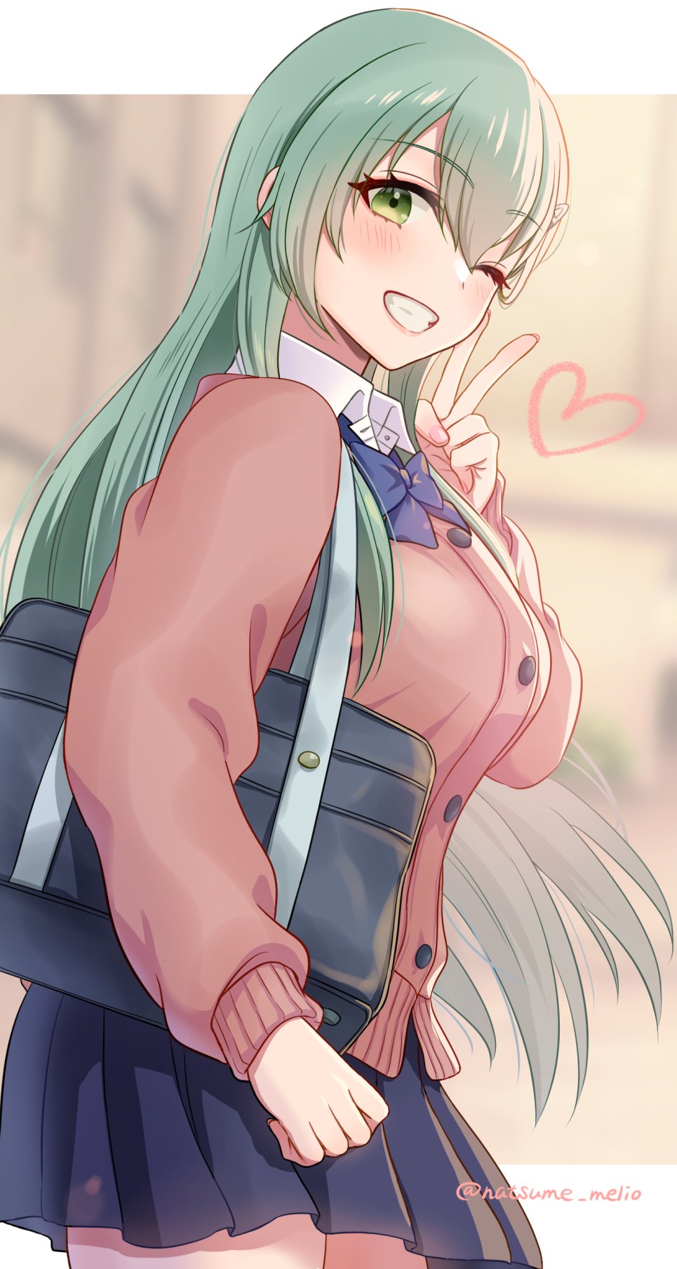 1girl alternate_costume bag blue_bow blue_bowtie blush bow bowtie breasts cardigan cowboy_shot green_eyes green_hair grin gyaru hair_between_eyes hair_ornament hairclip heart highres kantai_collection long_hair long_sleeves looking_at_viewer natsume_(natsume_melio) one_eye_closed pink_cardigan pleated_skirt school_bag shirt skirt smile solo suzuya_(kancolle) twitter_username v very_long_hair white_shirt