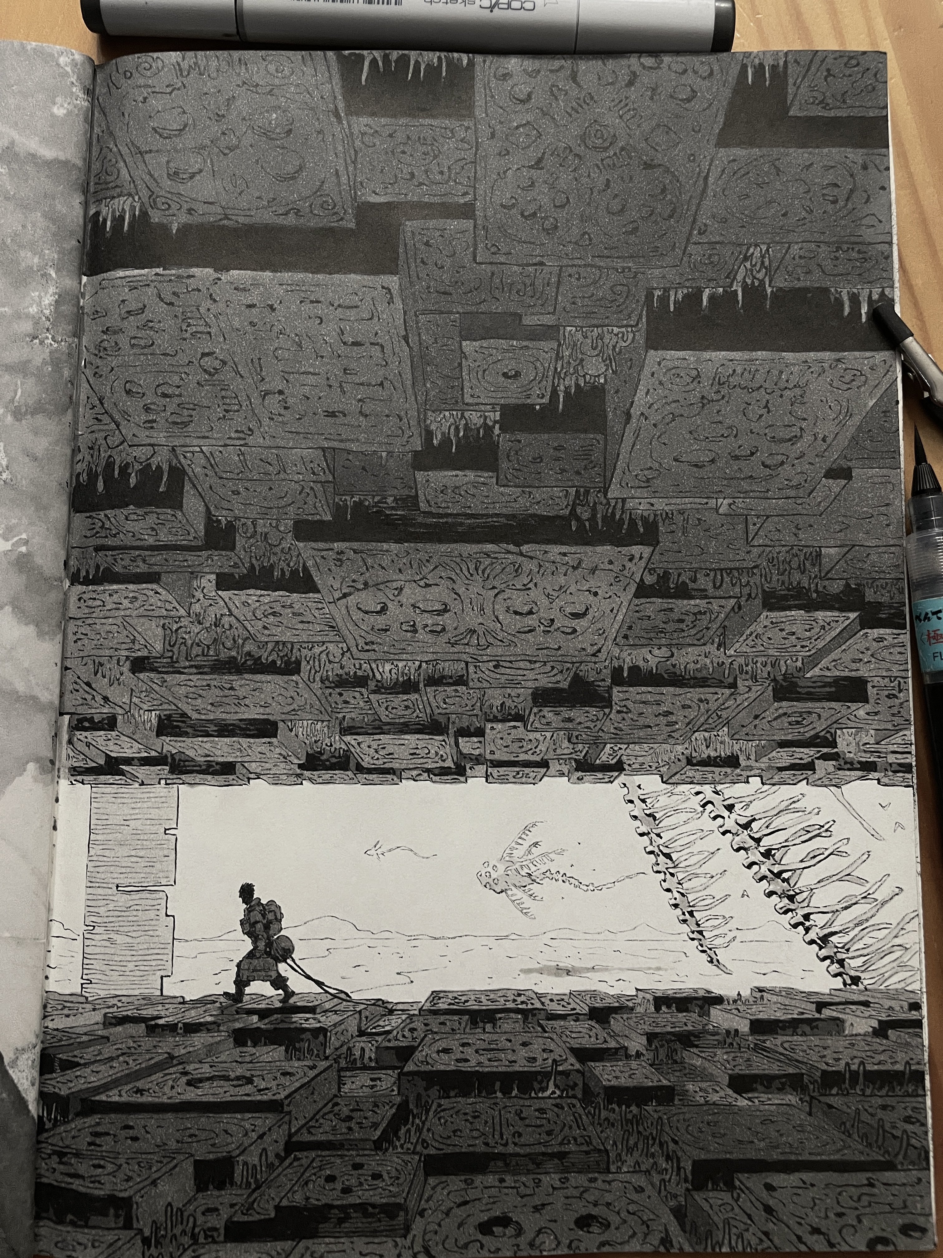 1boy absurdres alien backpack bag boots full_body greyscale highres knee_boots long_sleeves luan_tie marker_(medium) monochrome moss original pants photo_(medium) ruins scenery short_hair solo traditional_media walking wide_shot