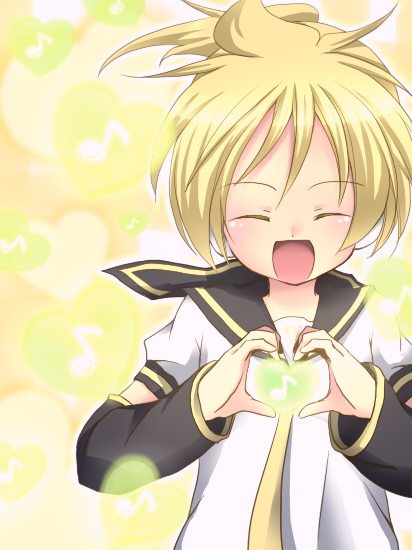 1boy black_sailor_collar blonde_hair closed_eyes commentary detached_sleeves eighth_note heart heart_background heart_hands kagamine_len male_focus musical_note open_mouth sailor_collar sailor_shirt shirt sleeves_past_wrists smile solo tsujiori vocaloid