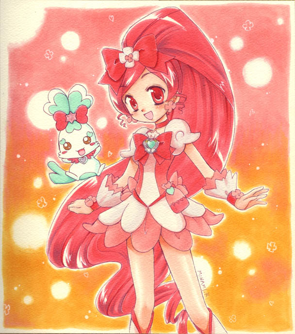 10s 1girl boots bow brooch choker chypre_(precure) creature cure_blossom earrings female_focus flower hair_flower hair_ornament hair_ribbon hanasaki_tsubomi happy heart heart_brooch heartcatch_precure! high_ponytail jewelry long_hair magical_girl marker_(medium) mascot millipen_(medium) minami_kawa pen_(medium) pink_hair ponytail precure red_eyes ribbon skirt solo traditional_media wrist_cuffs