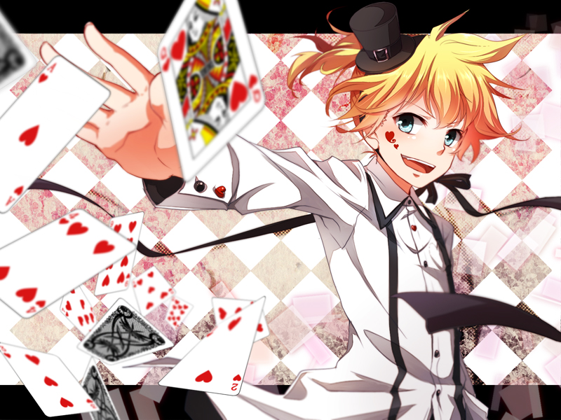 1boy blonde_hair blue_eyes blurry card checkered_background commentary_request depth_of_field facial_hair foreshortening hat kagamine_len male_focus mini_hat mini_top_hat open_mouth outstretched_arm playing_card ponytail shirt short_ponytail smile solo tilted_headwear top_hat tsujiori vocaloid white_shirt