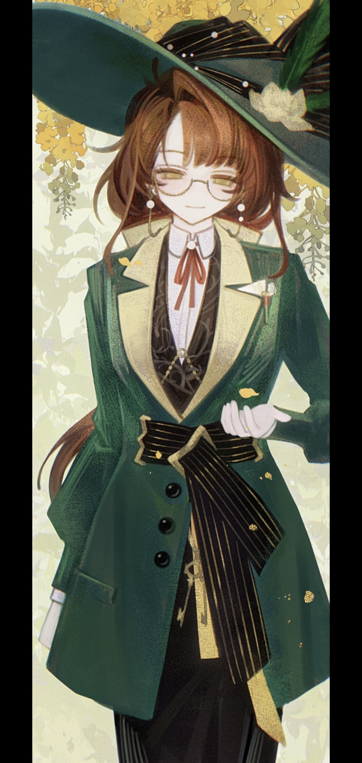 1girl absurdres black_skirt brown_hair closed_mouth collared_shirt cowboy_shot eyewear_strap feathers flower glasses gloves green_background green_eyes green_feathers green_hat green_jacket half-closed_eyes hand_up hat hat_feather hat_flower highres jacket kakania_(reverse:1999) looking_at_viewer low_ponytail neck_ribbon nullity outstretched_hand petals picture_hat pillarboxed ponytail red_ribbon reverse:1999 ribbon round_eyewear shirt skirt smile solo white_gloves white_shirt yellow_flower yellow_petals