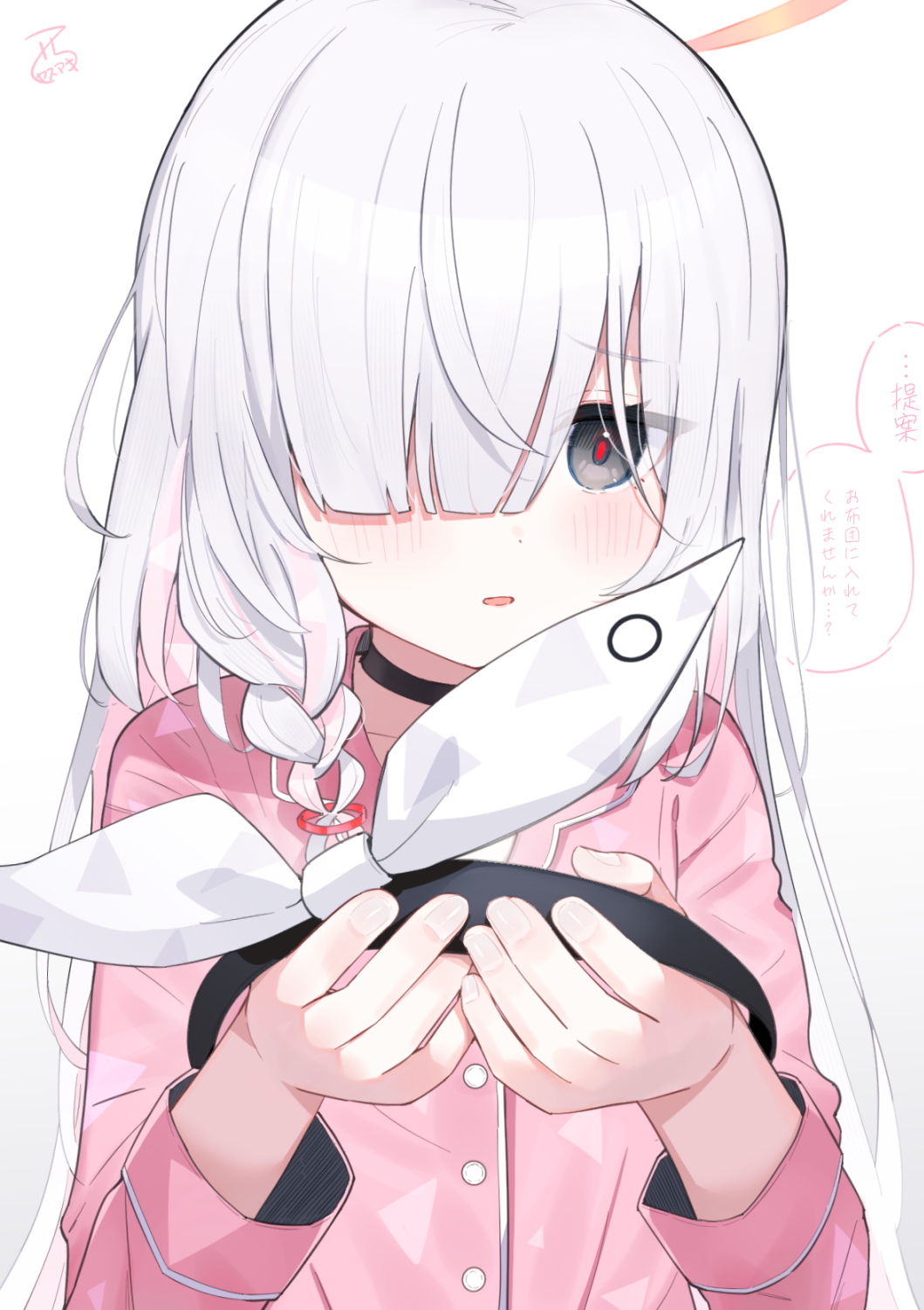 1girl black_choker black_eyes black_hairband blue_archive blush braid choker colored_inner_hair commentary_request grey_hair hair_over_one_eye hairband halo highres holding_hairband long_hair long_sleeves looking_at_viewer multicolored_hair nishi_yasuaki pajamas pink_hair plana_(blue_archive) red_halo red_pupils single_braid solo speech_bubble translation_request two-tone_hair