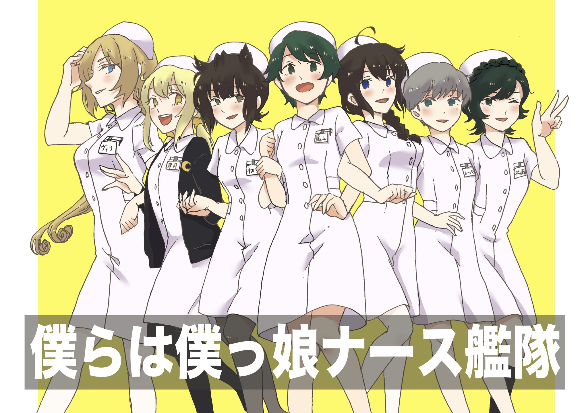 1girl ahoge black_hair black_jacket black_pantyhose blonde_hair blue_eyes brown_eyes commentary_request dress feet_out_of_frame green_hair grey_hair grey_pantyhose hat hatsuzuki_(kancolle) highres id_card jacket kantai_collection long_hair matsukaze_(kancolle) mogami_(kancolle) nurse nurse_cap one_eye_closed pantyhose satsuki_(kancolle) shigure_(kancolle) shigure_kai_ni_(kancolle) solo trait_connection translation_request valiant_(kancolle) white_dress white_hat white_pantyhose yellow_background yellow_eyes z1_leberecht_maass_(kancolle) zima_(goofy)