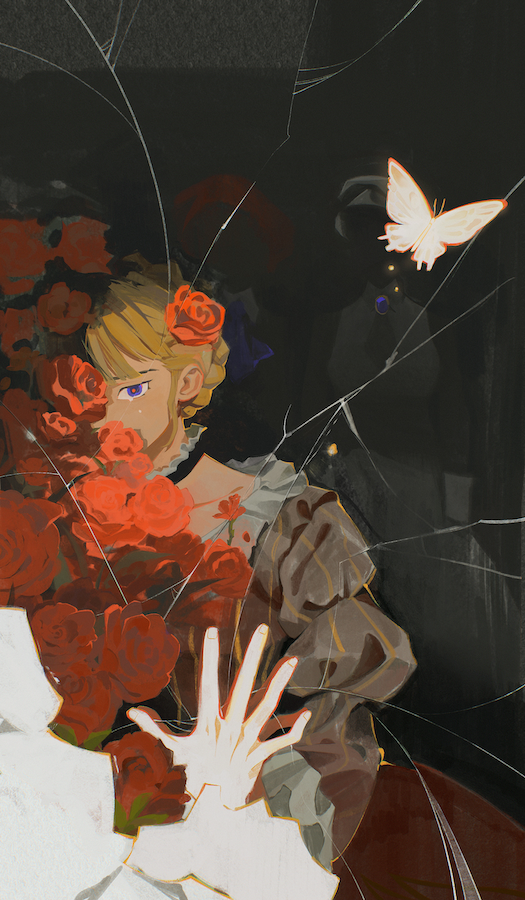 1boy 2girls 404_hemao beatrice_(umineko) blonde_hair blue_eyes broken_mirror brown_dress bug butterfly cowboy_shot crying crying_with_eyes_open dress fingernails flower hair_flower hair_ornament insect kanon_(umineko) mirror multiple_girls red_flower red_rose rose shannon_(umineko) solo_focus tears umineko_no_naku_koro_ni witch