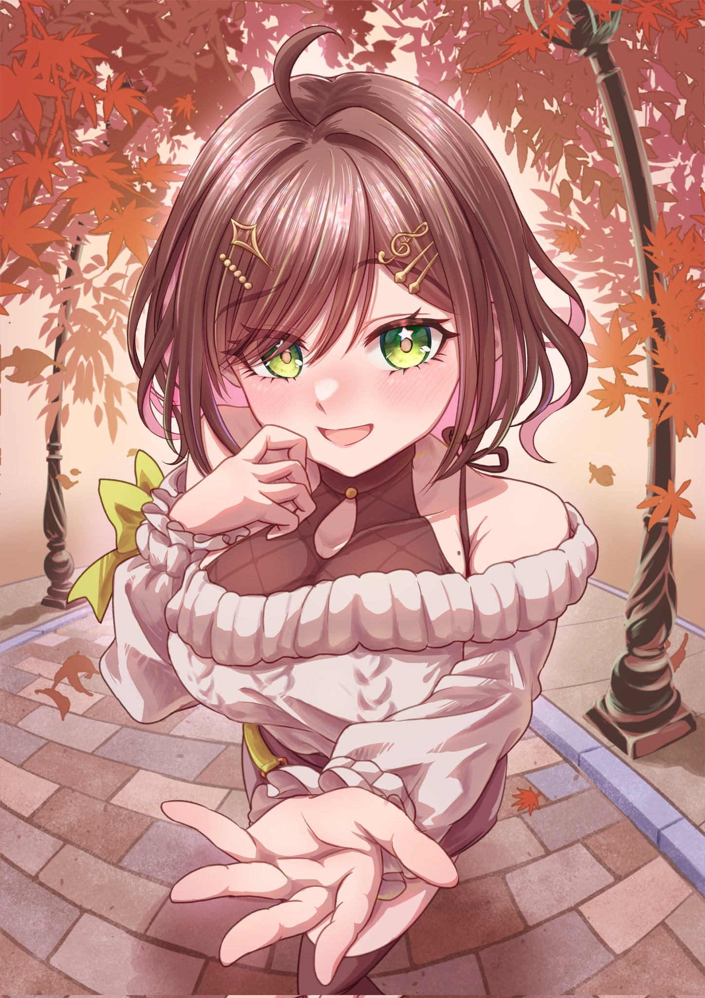 1girl ahoge autumn_leaves bare_shoulders belt bow breasts brick_road brown_hair brown_shirt brown_skirt brown_thighhighs cable_knit colored_inner_hair commentary commission commissioner_upload english_commentary falling_leaves fisheye fortissimo green_belt green_bow green_eyes hair_ornament halter_shirt halterneck highres indie_virtual_youtuber lamppost large_breasts leaf long_sleeves looking_at_viewer miori_celesta miori_celesta_(casual) mole mole_on_armpit multicolored_hair musical_note musical_note_hair_ornament off-shoulder_sweater off_shoulder open_mouth outdoors outstretched_hand pink_hair radium0727 reaching reaching_towards_viewer second-party_source shirt short_hair skirt solo standing star_(symbol) star_in_eye sweater symbol_in_eye thighhighs treble_clef virtual_youtuber white_sweater