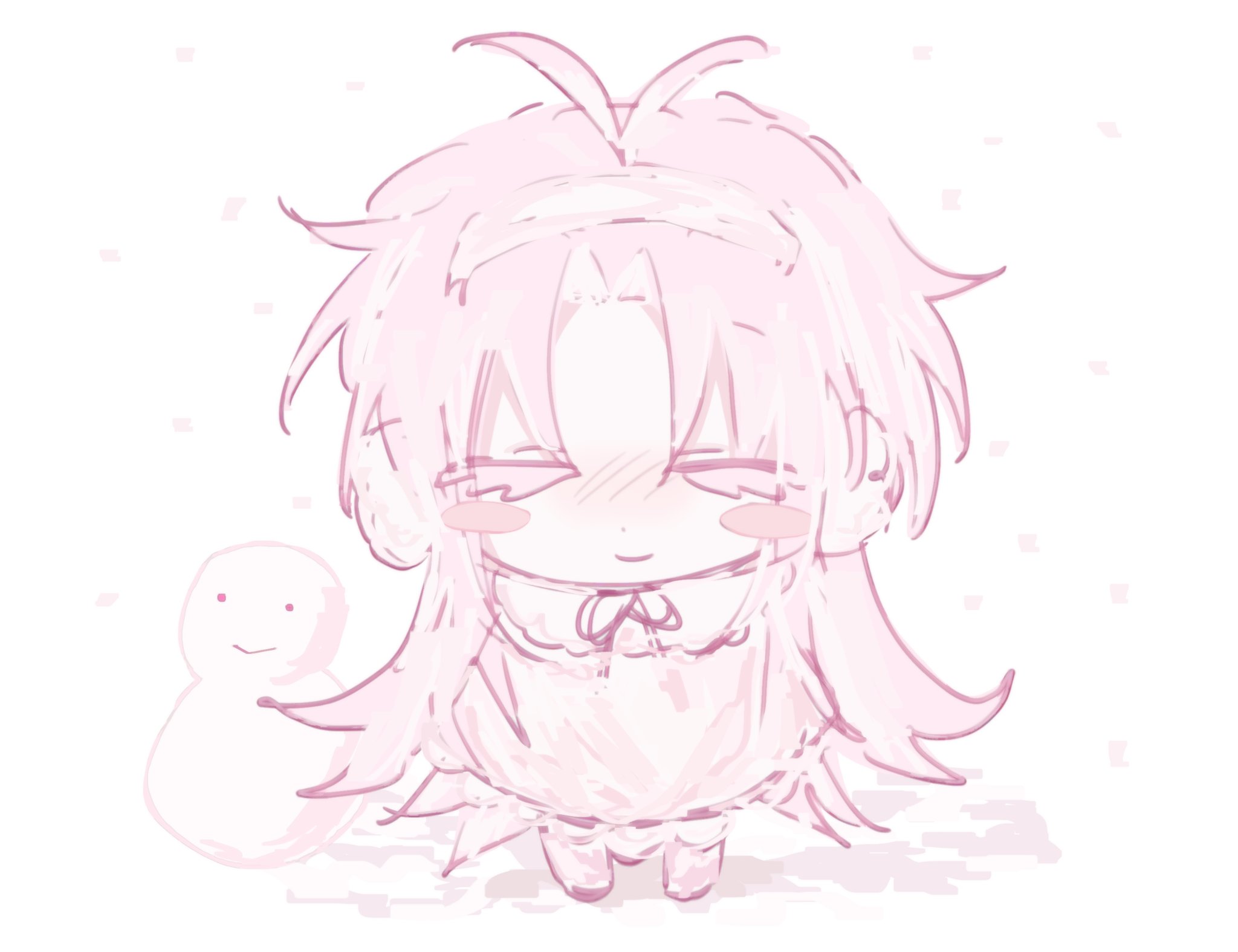 1boy alternate_costume antenna_hair blush blush_stickers boots chibi chibi_only closed_eyes closed_mouth coat colored_eyelashes commentary curtained_hair earmuffs hatsutori_hajime highres long_hair male_focus meshi_(f7oi4f) neck_ribbon nose_blush parted_bangs pink_boots pink_coat pink_hair pink_shoes pink_theme ribbon saibou_shinkyoku shoes sketch smile snowing snowman solo untranslatable_commentary white_background