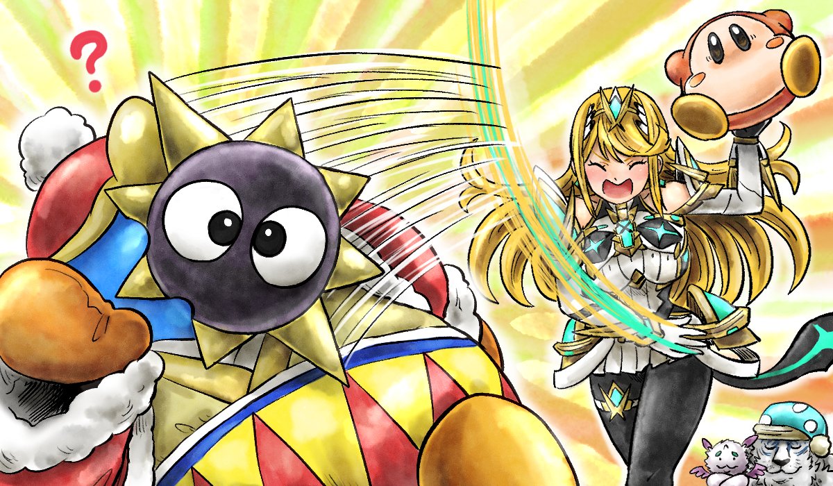 1girl ? azurda_(xenoblade) blonde_hair blush blush_stickers closed_eyes dromarch_(xenoblade) gordo hat kicdon king_dedede kirby_(series) mythra_(massive_melee)_(xenoblade) mythra_(xenoblade) nightcap nintendo pantyhose pom_pom_(clothes) scene_reference super_smash_bros. throwing waddle_dee xenoblade_chronicles_(series) xenoblade_chronicles_2
