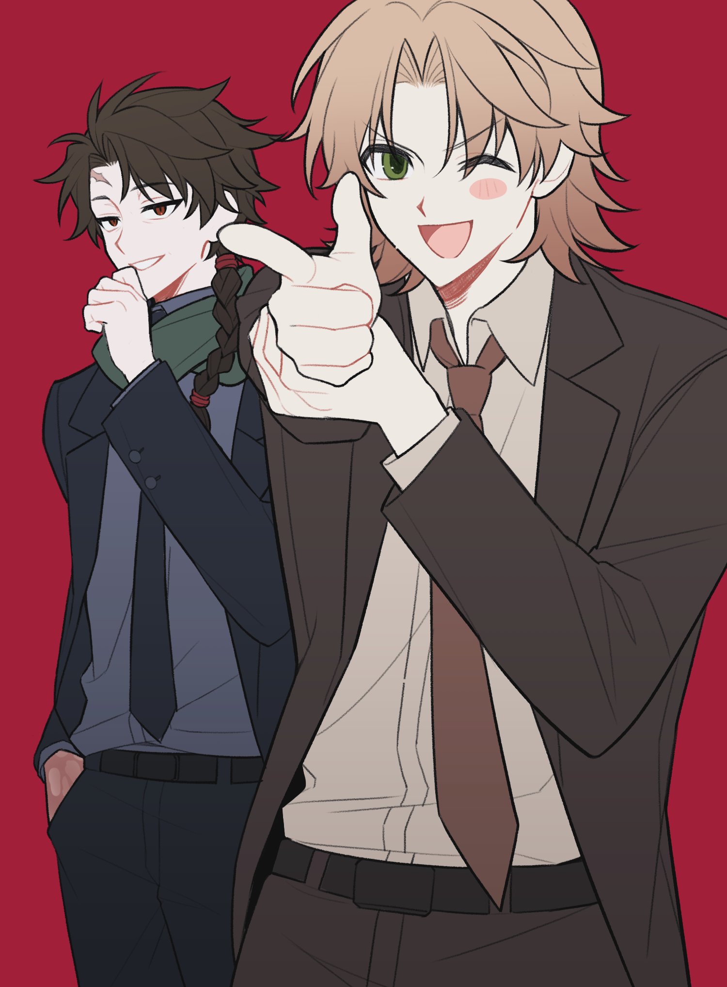 2boys ;d abysscake alternate_costume belt black_belt black_jacket black_pants blush_stickers braid brown_hair brown_jacket brown_necktie brown_pants collared_shirt commentary_request curtained_hair finger_gun green_eyes grey_shirt grin hand_on_own_wrist harada_minoru highres jacket korean_commentary long_sleeves male_focus multiple_boys necktie one_eye_closed open_mouth pants parted_bangs red_background saibou_shinkyoku shinano_eiji shirt short_hair side_braid simple_background single_blush_sticker single_braid smile v-shaped_eyebrows