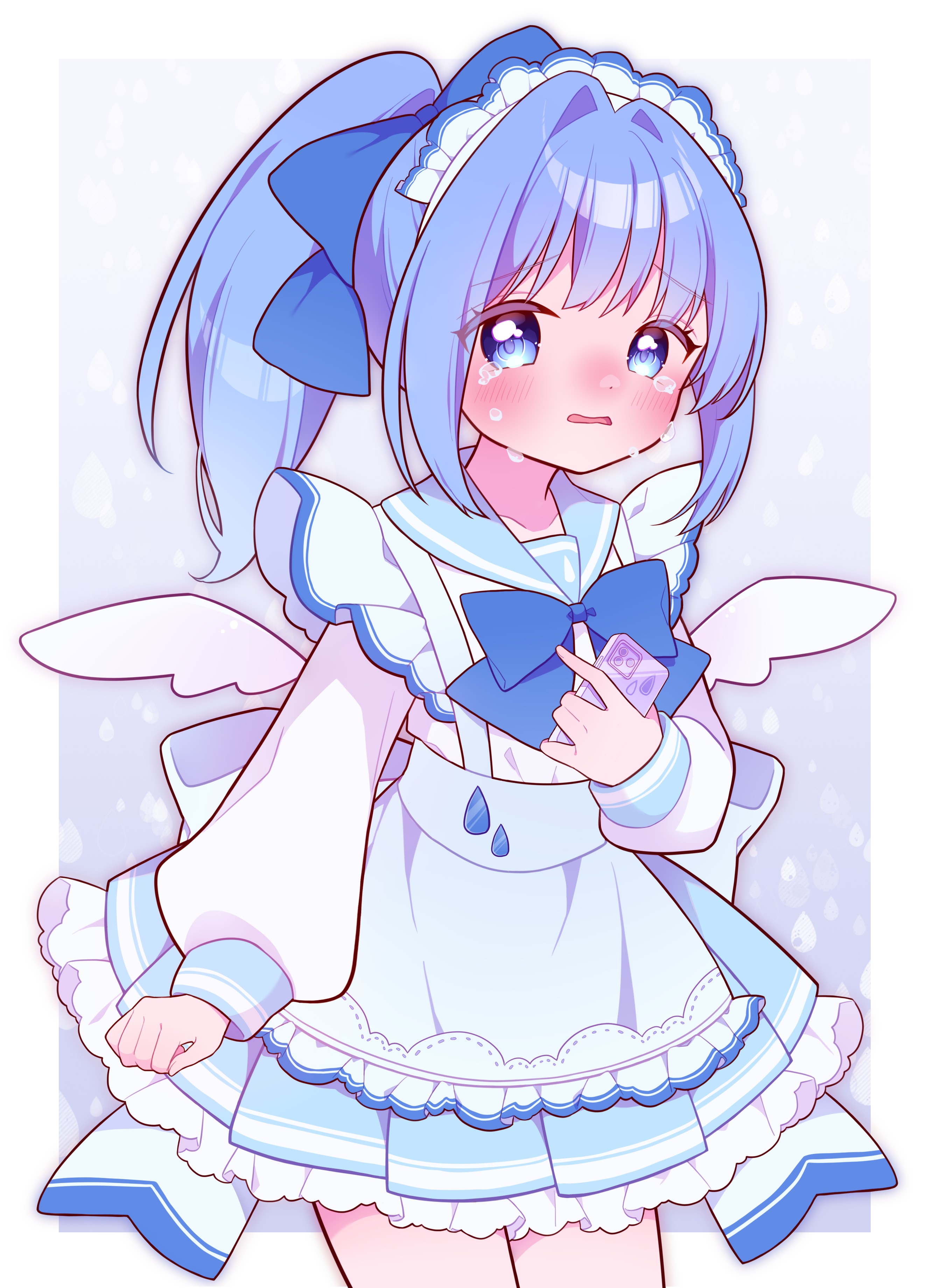 1girl absurdres blue_bow blue_bowtie blue_eyes blue_hair blue_sailor_collar blush border bow bowtie cellphone crying hair_bow highres holding long_sleeves looking_at_viewer maid_headdress open_mouth original outside_border phone ponytail sailor_collar smartphone solo tears umecha_0 white_border wings