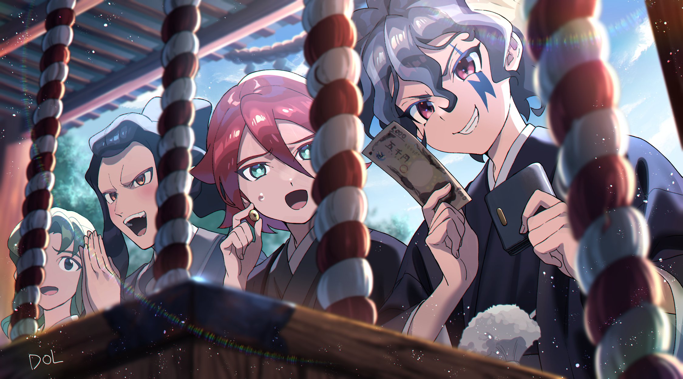 4boys box coin dolustoy donation_box eisei_gakuen haori haori_himo hatsumoude highres holding holding_coin holding_money holding_wallet inazuma_eleven_(series) inazuma_eleven_ares_no_tenbin japanese_clothes kira_hiroto kiyama_hiroto kouhaku_nawa male_focus midorikawa_ryuuji money multiple_boys new_year praying rope saginuma_osamu shimenawa shrine snow snowing sweatdrop wallet