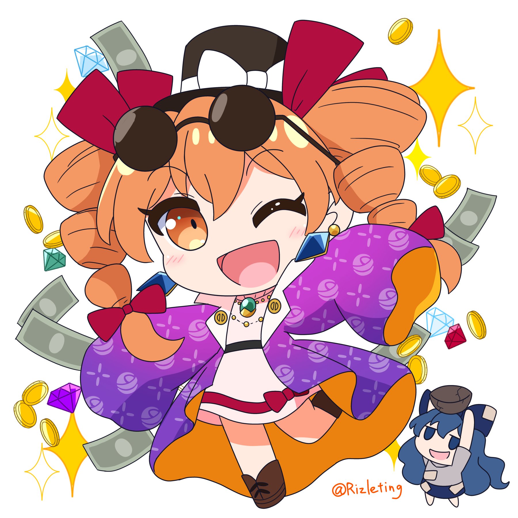 2girls ;d arms_up banknote barefoot black_hat blue_bow blue_eyes blue_hair blue_skirt blush boots bow bowl brown_footwear coat coin commentary_request diamond_(gemstone) dress drill_hair earrings eyewear_on_head floral_print full_body grey_hoodie hair_bow hair_ribbon hat hat_bow highres holding holding_bowl hood hoodie jewelry long_hair long_sleeves looking_at_viewer money multiple_girls necklace one_eye_closed open_clothes open_coat open_mouth orange_coat orange_eyes orange_hair patch pendant purple_coat red_ribbon ribbon rizleting round_eyewear short_hair short_sleeves simple_background skirt sleeves_past_fingers sleeves_past_wrists smile sparkle standing standing_on_one_leg sunglasses top_hat touhou twin_drills twitter_username two-sided_coat two-sided_fabric very_long_hair white_background white_bow white_dress yorigami_jo'on