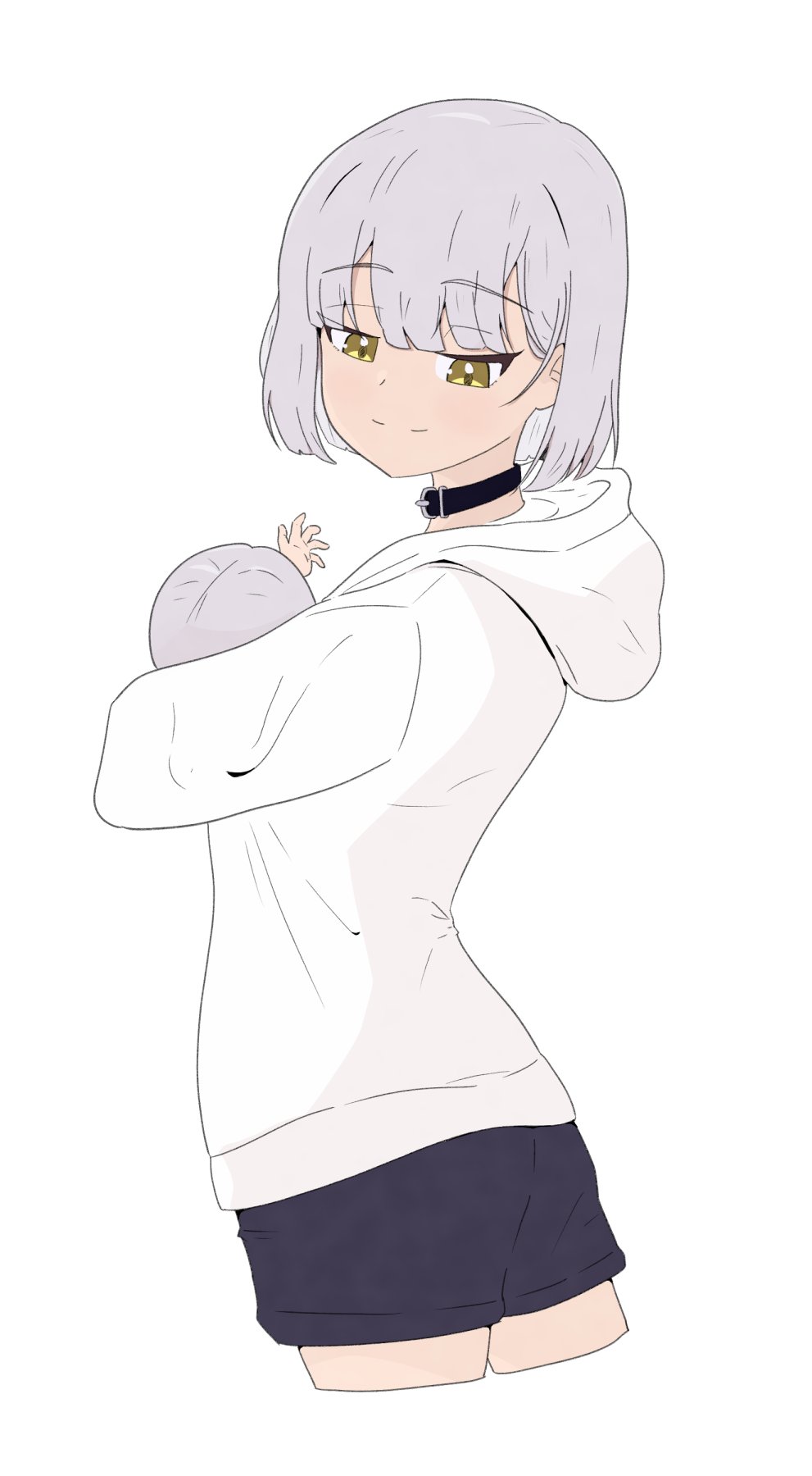 1boy 1girl baby belt_collar black_shorts carrying carrying_baby carrying_person catnamenothing closed_mouth collar commentary cowboy_shot cropped_legs grey_hair highres hood hood_down hoodie kanade_kanon kanade_kanon's_son kanade_kanon_(4th_costume) mother_and_child mother_and_son nanashi_inc. parent_and_child shorts simple_background smile virtual_youtuber white_background white_hoodie yellow_eyes