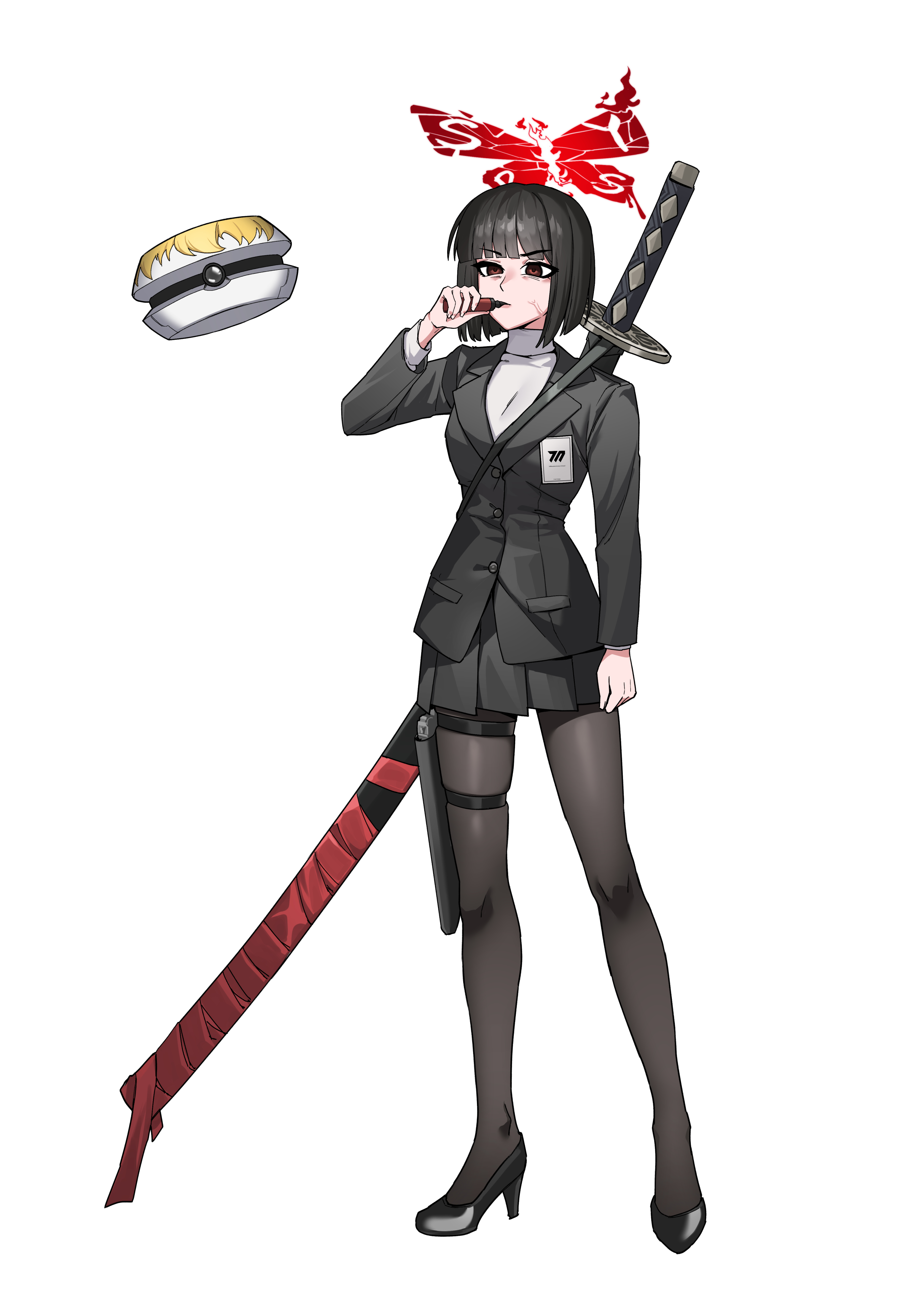 1girl absurdres black_hair black_shoes black_skirt blue_archive bob_cut brown_pantyhose cosplay full_body halo hand_up high_heels highres limbus_company ootachi pantyhose pleated_skirt project_moon red_eyes red_halo rio_(blue_archive) rio_(blue_archive)_(cosplay) rodeong_r ryoshu_(project_moon) shoes simple_background skirt solo sweater white_background white_sweater