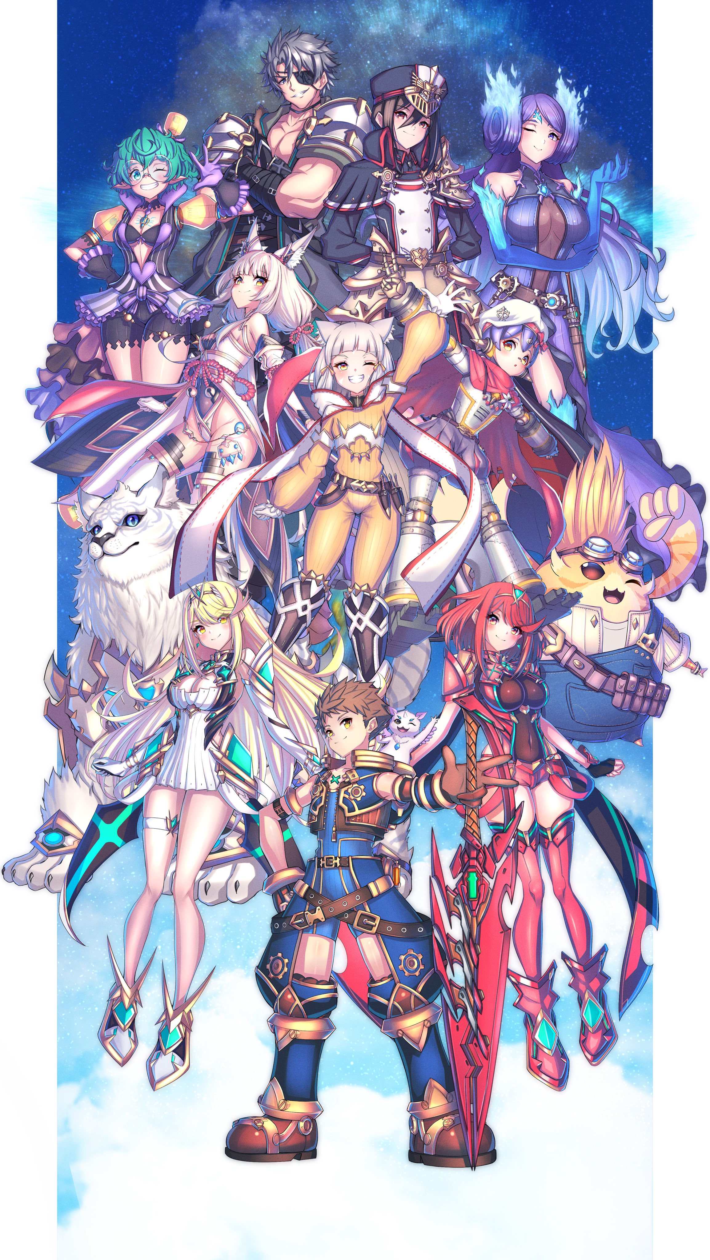 2boys 6+girls absurdres aegis_sword_(xenoblade) animal_ears azurda_(xenoblade) bare_legs bare_shoulders black_gloves blonde_hair blunt_bangs bodysuit breasts brighid_(xenoblade) cat_ears cat_girl chest_jewel cleavage cleavage_cutout clothing_cutout detached_sleeves dress dromarch_(xenoblade) earrings elbow_gloves facial_mark fingerless_gloves gloves grey_hair hakusai_(hksicabb) highleg highleg_leotard highres jewelry large_breasts leotard long_hair low_twintails morag_ladair_(xenoblade) multiple_boys multiple_girls mythra_(xenoblade) nia_(blade)_(xenoblade) nia_(xenoblade) nopon pandoria_(xenoblade) poppi_(xenoblade) poppi_alpha_(xenoblade) pyra_(xenoblade) red_eyes red_hair red_shorts rex_(xenoblade) short_dress short_hair short_shorts shorts small_breasts spoilers swept_bangs sword thigh_strap thighhighs tiara tora_(xenoblade_2) twintails very_long_hair weapon white_dress white_footwear white_gloves xenoblade_chronicles_(series) xenoblade_chronicles_2 yellow_bodysuit yellow_eyes zeke_von_genbu_(xenoblade)