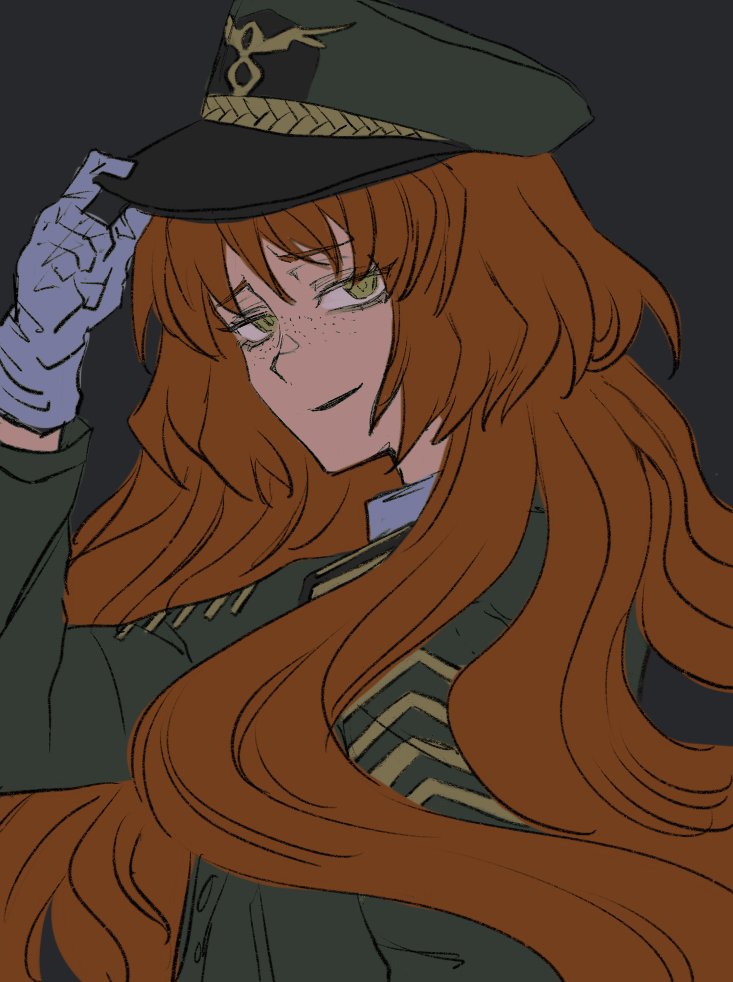 1girl black_background gloves green_eyes hat hat_tip ishmael_(project_moon) jacket limbus_company long_hair military_jacket moyiliu3 peaked_cap pequod_(identity)_(project_moon) project_moon smile solo white_gloves