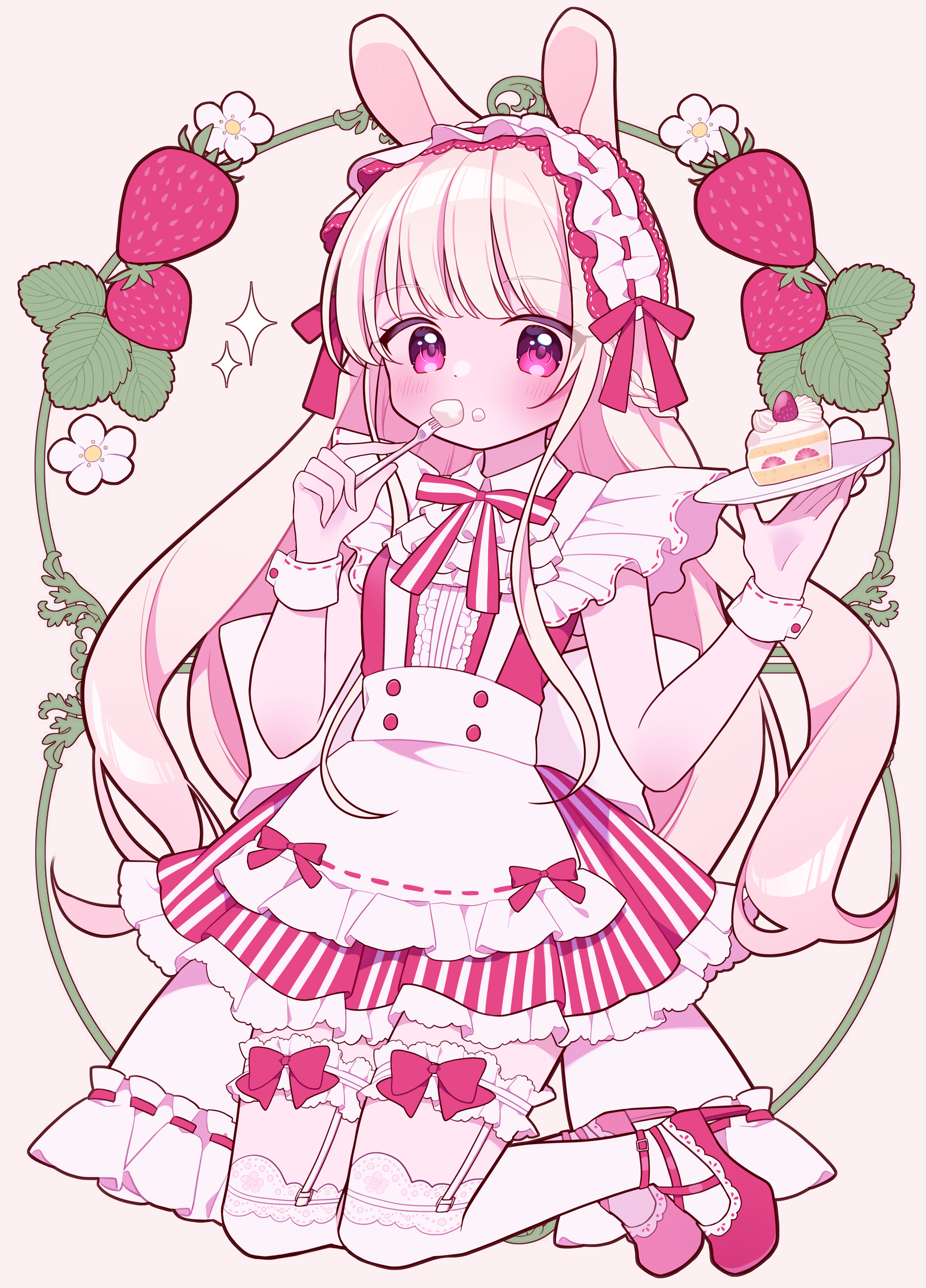 1girl absurdres animal_ears cake food fork frilled_hairband frills fruit hairband high_heels highres holding holding_fork holding_plate long_hair looking_at_viewer maid original plate red_eyes red_footwear solo strawberry strawberry_shortcake umecha_0 white_hair wrist_cuffs