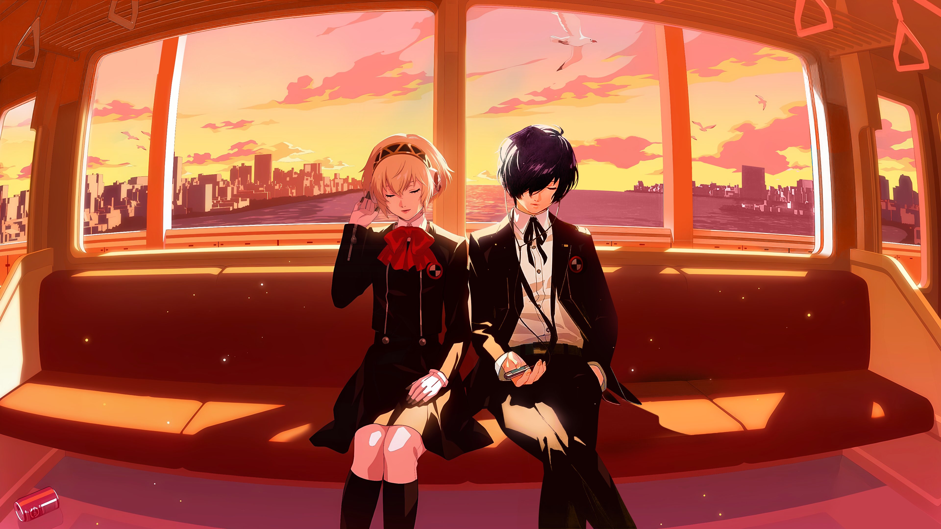 1boy 1girl absurdres aigis_(persona) bird black_hair black_jacket black_pants black_skirt blonde_hair bow bowtie can cityscape closed_eyes cloud cloudy_sky commentary mp3_player english_commentary gekkoukan_high_school_uniform hair_over_one_eye headband headphones highres jacket jurawings1 ocean pants persona persona_3 red_bow red_bowtie school_uniform seagull shirt short_hair sitting skirt sky sunset train_interior white_shirt yuuki_makoto_(persona_3)