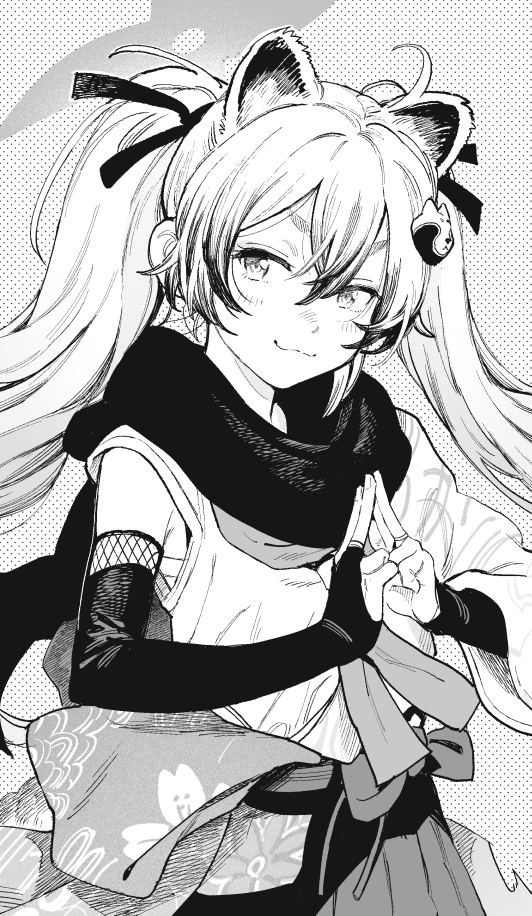 1girl :3 animal_ears animal_hair_ornament blue_archive blush detached_sleeves floral_print greyscale hair_between_eyes hair_ornament hair_ribbon halo hiro_(chumo) japanese_clothes kuji-in long_hair michiru_(blue_archive) monochrome multicolored_hair neckerchief raccoon_ears raccoon_girl raccoon_hair_ornament ribbon scarf simple_background single_detached_sleeve solo twintails