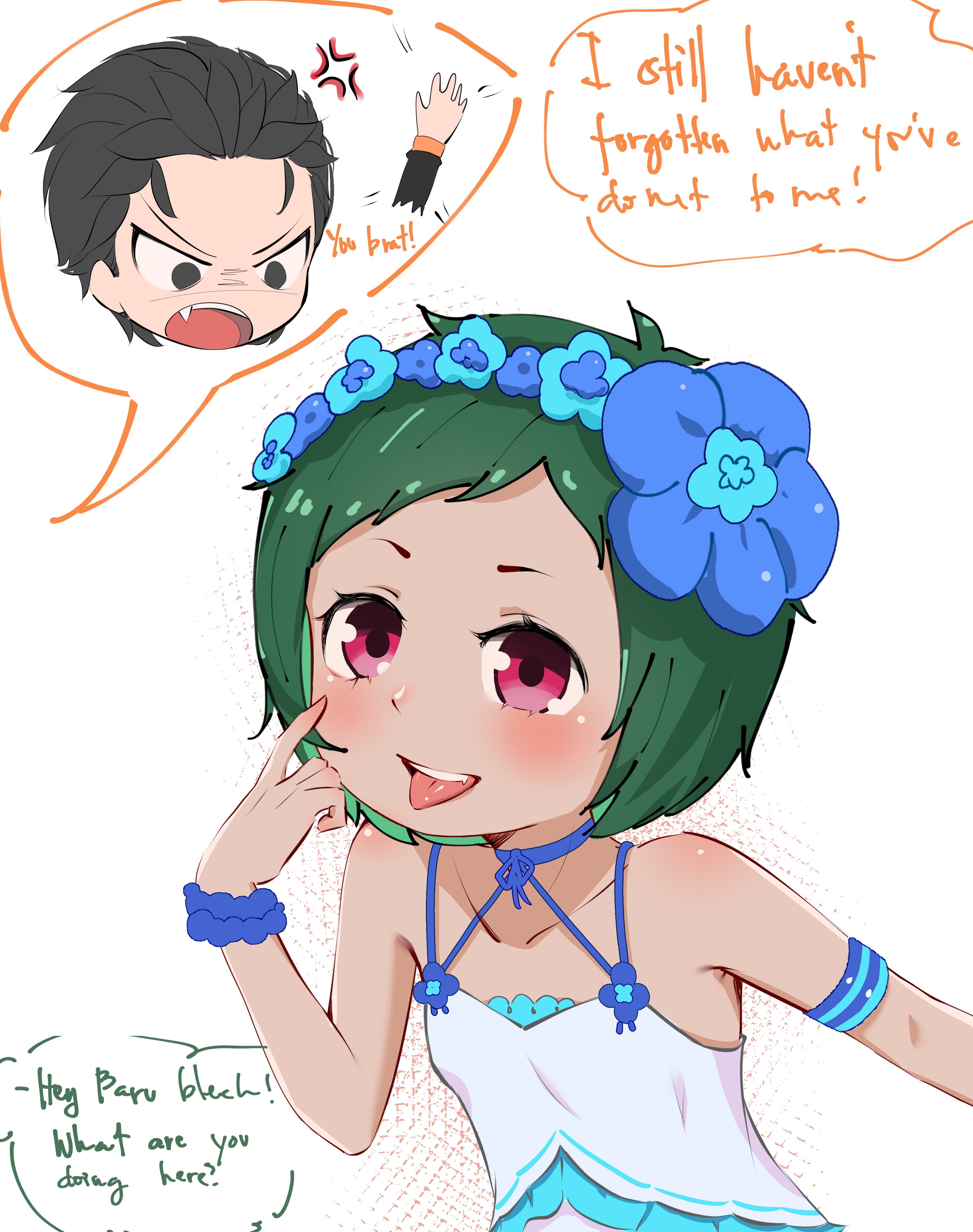 1boy 1girl :p absurdres anger_vein babywipes black_eyes black_hair blue_flower blush chibi english_text eyelid_pull fang flat_chest flower green_hair hair_flower hair_ornament highres looking_at_viewer natsuki_subaru open_mouth pink_eyes re:zero_kara_hajimeru_isekai_seikatsu short_hair speech_bubble tongue tongue_out typhon_(re:zero) white_background