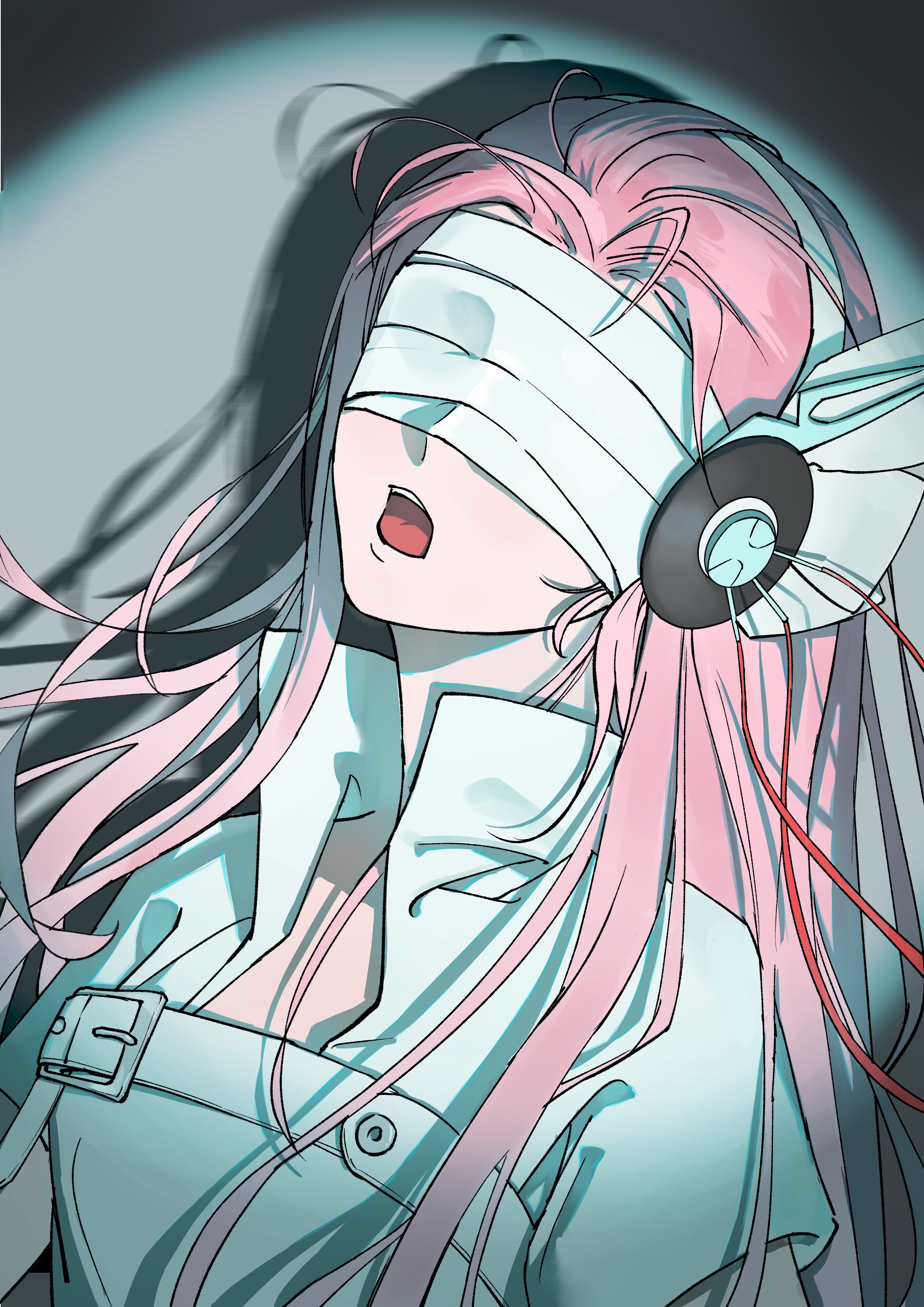 1girl absurdres ahuang_bushi_huanggou alien_stage chinese_commentary commentary_request covered_eyes dress headphones highres long_hair mizi_(alien_stage) official_alternate_costume open_mouth pink_hair popped_collar portrait solo spotlight white_dress