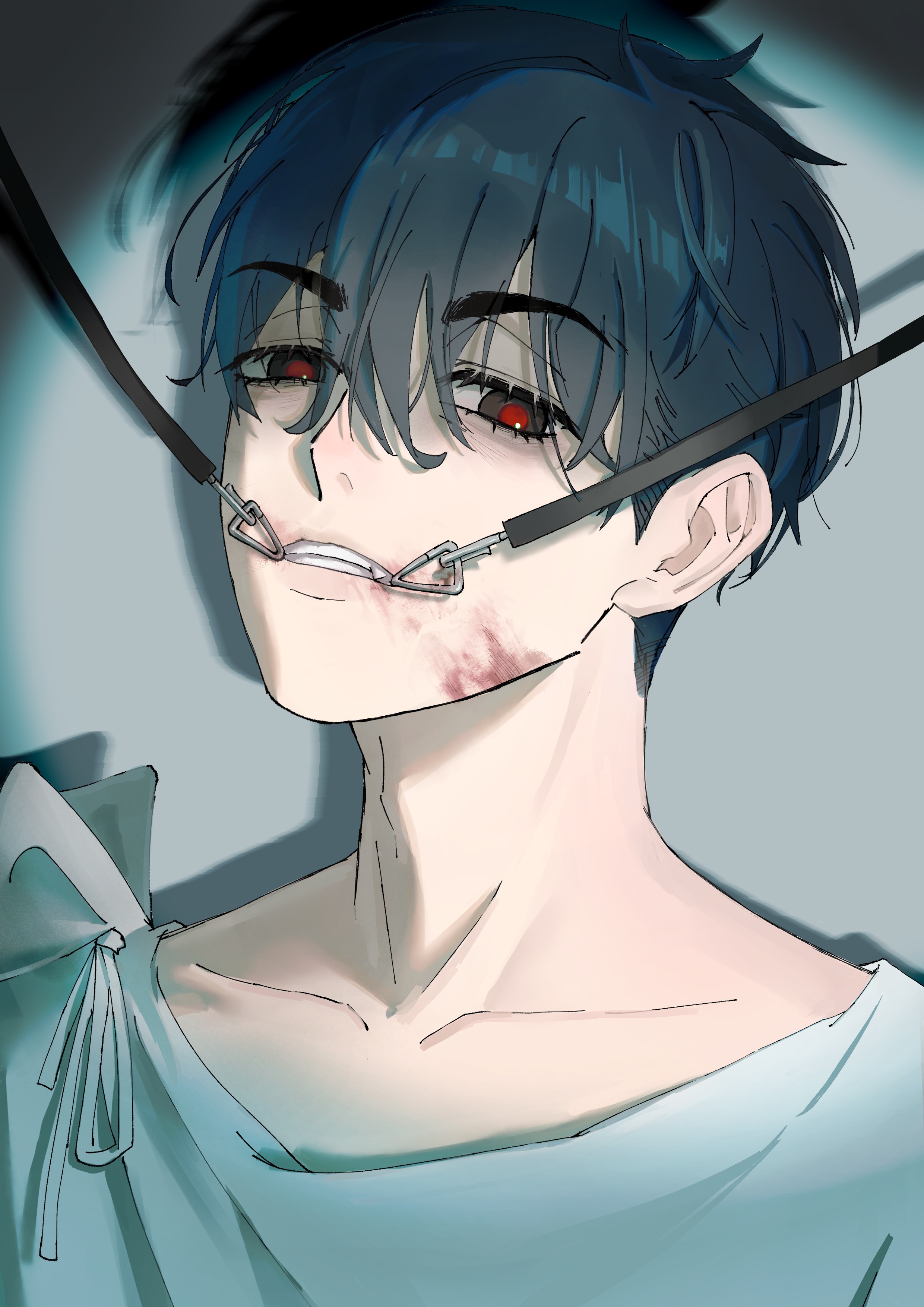 1boy absurdres ahuang_bushi_huanggou alien_stage black_eyes black_hair blood blood_on_face chinese_commentary commentary_request forced_smile hair_between_eyes highres ivan_(alien_stage) looking_at_viewer male_focus portrait red_pupils shirt short_hair solo spotlight very_short_hair white_shirt