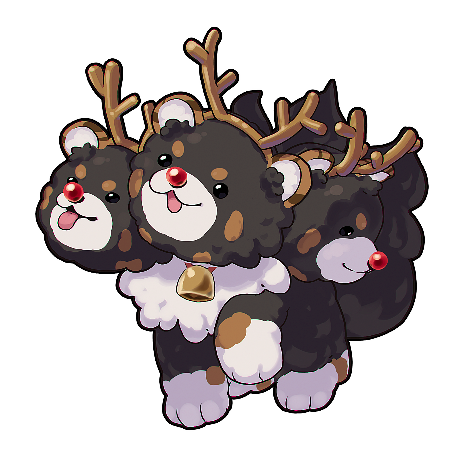 animal_focus bell cerberus dog fake_antlers highres multiple_heads nanashi_inc. no_humans none_(fan_774) red_nose simple_background transparent_background