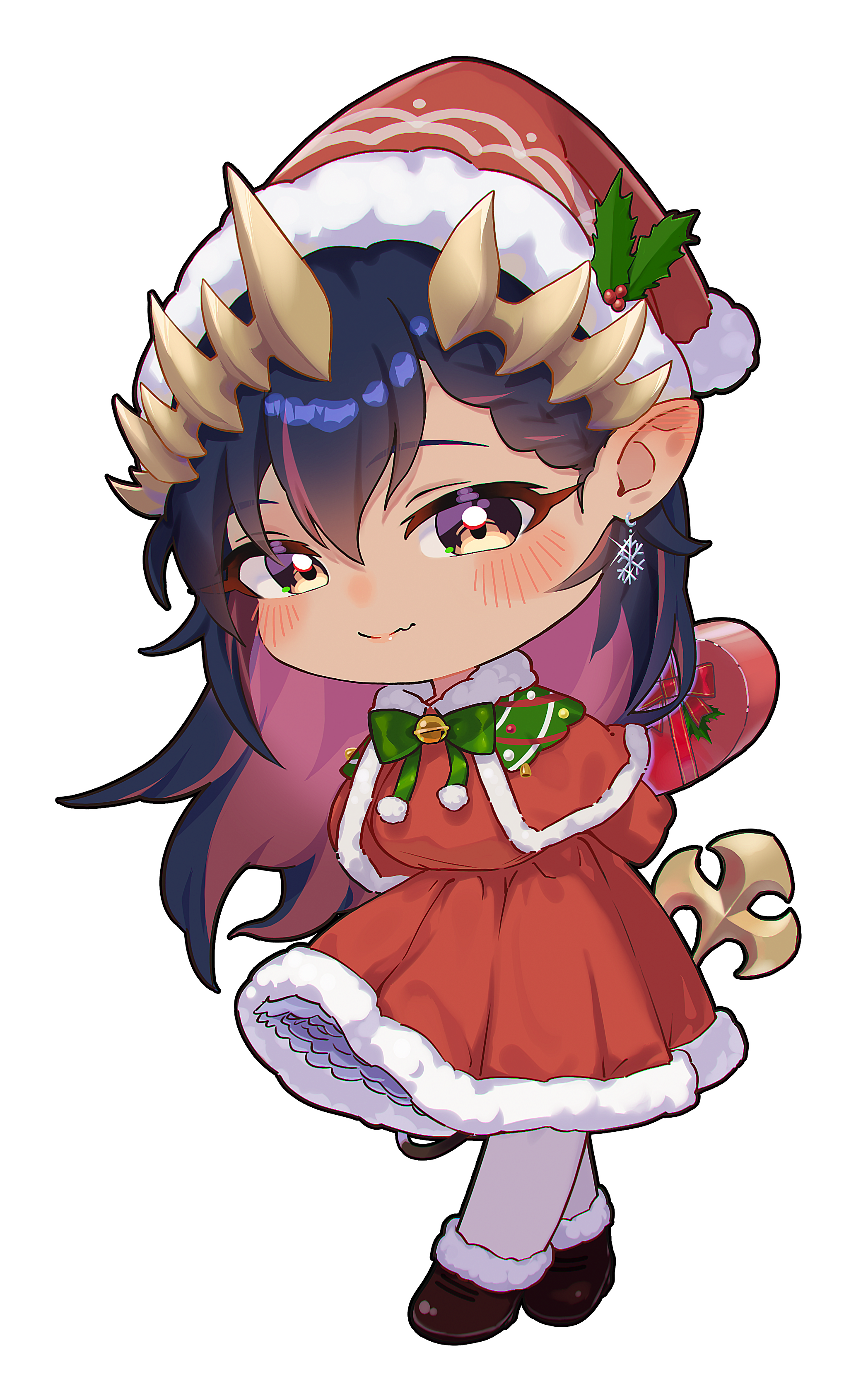 1girl absurdres alternate_costume black_shoes blush bow bowtie box brown_eyes brown_horns capelet chibi chibi_only closed_mouth colored_inner_hair commentary_request dark-skinned_female dark_skin demon_girl demon_tail dress ear_blush earrings full_body fur-trimmed_capelet fur-trimmed_dress fur_trim green_bow green_bowtie hair_between_eyes hat hat_ornament heart-shaped_box highres holly_hat_ornament horns jewelry long_hair looking_at_viewer multicolored_hair nanashi_inc. none_(fan_774) pantyhose pink_hair pointy_ears red_capelet red_dress santa_costume santa_hat shimamura_charlotte shoes simple_background smile snowflake_earrings solo tail tan transparent_background virtual_youtuber white_pantyhose