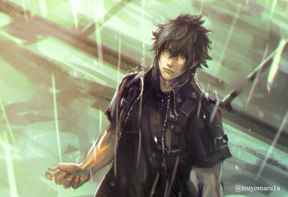 1boy arm_up black_hair black_jacket black_shirt blue_eyes closed_mouth collared_jacket commentary_request crew_neck dripping final_fantasy final_fantasy_xv hair_between_eyes jacket looking_up male_focus noctis_lucis_caelum popped_collar rain shirt short_hair solo standing t-shirt tsuyomaru twitter_username unzipped upper_body water_drop wet wet_clothes wet_hair zipper