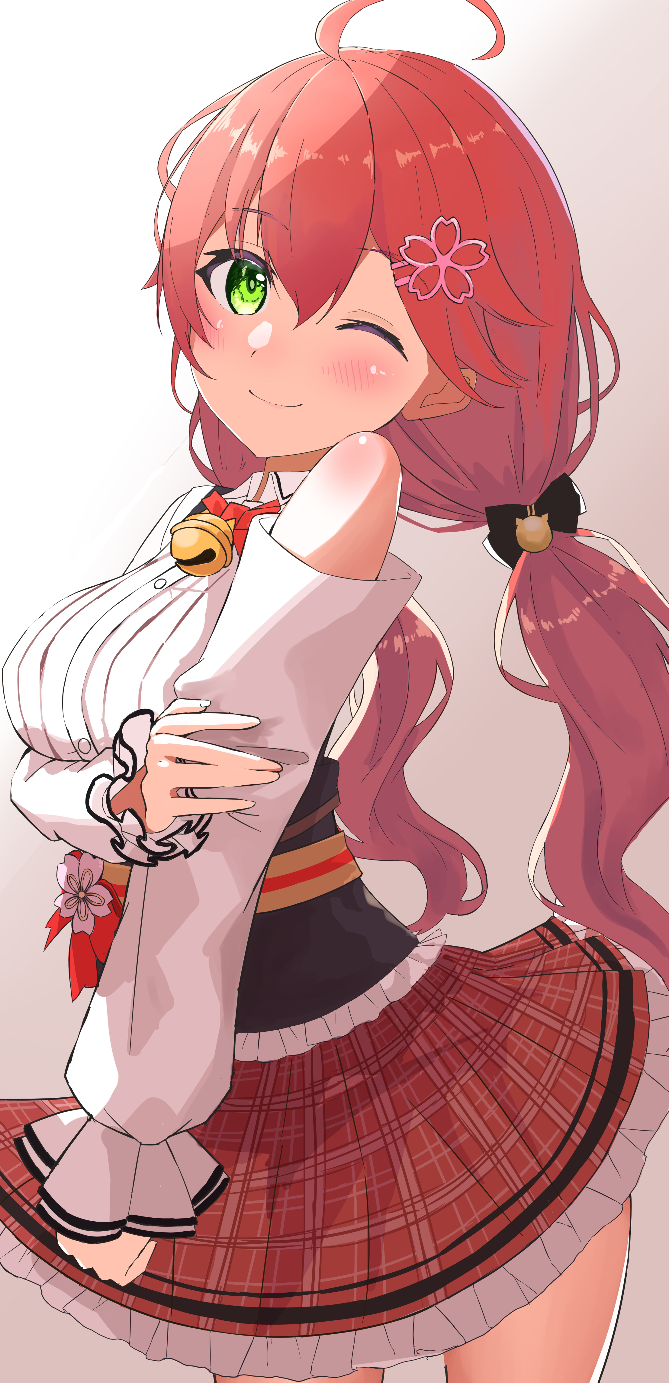 1girl ;) absurdres ahoge bell blush bodice bow bowtie breasts clenched_hand clothing_cutout collared_shirt flower frilled_sleeves frills hand_on_own_arm green_eyes hair_between_eyes hair_flower hair_ornament hairclip hand_on_own_arm highres hololive large_breasts long_hair long_sleeves looking_at_viewer low_twintails neck_bell official_alternate_costume one_eye_closed pink_hair plaid_clothes plaid_skirt pleated_skirt red_bow red_bowtie red_skirt sakura_miko sakura_miko_(casual) shirt shoulder_cutout skirt smile solo teri0032 turning_head twintails virtual_youtuber white_shirt