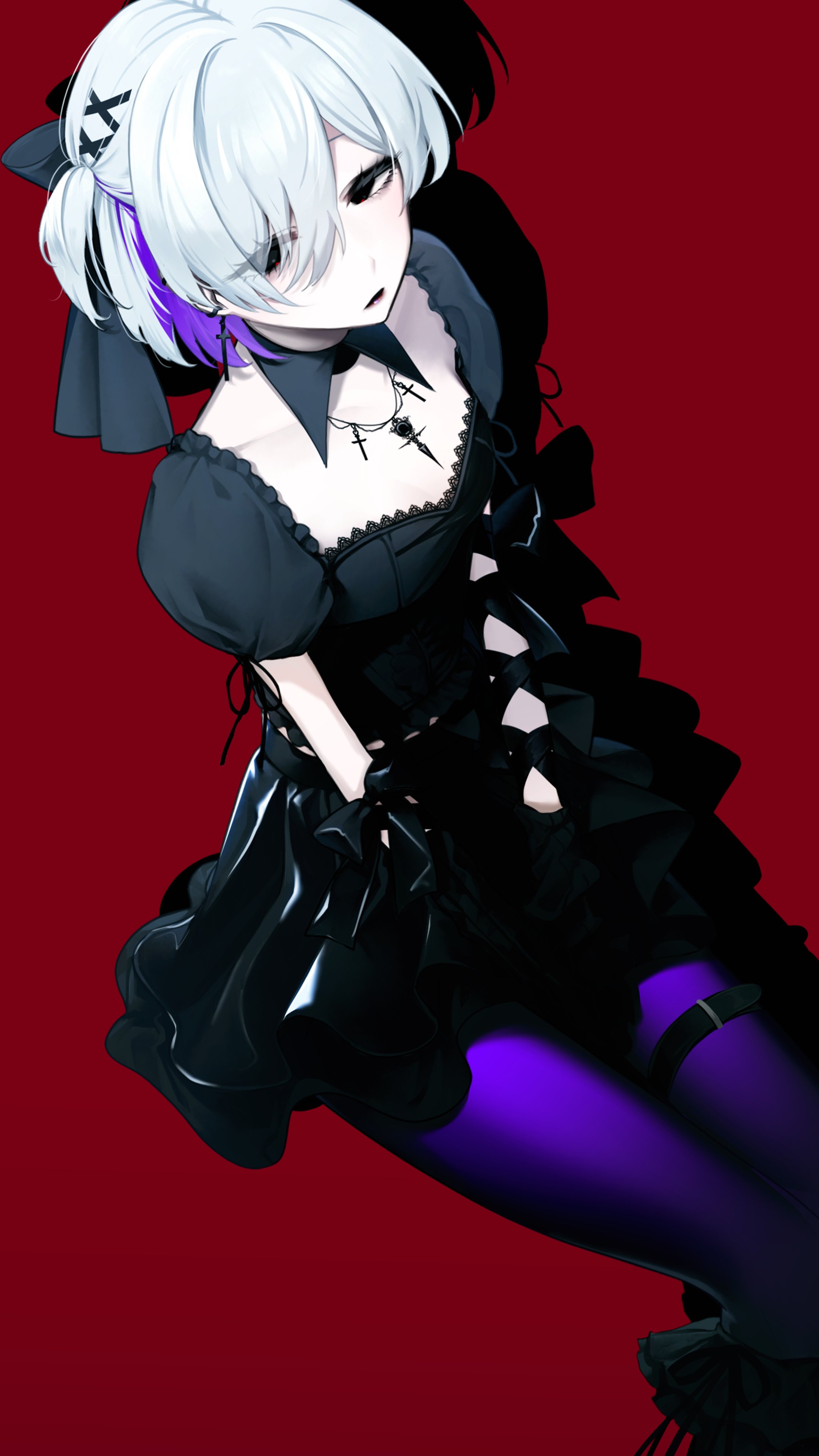 1girl absurdres black_bow black_eyes black_hair black_lips black_ribbon black_skirt blouse bow cross detached_sleeves expressionless eyes_visible_through_hair gothic_lolita hair_ornament hair_over_one_eye hands_on_lap highres jewelry layered_skirt lipstick lolita_fashion makeup multicolored_hair necklace original pale_skin pantyhose puffy_short_sleeves puffy_sleeves purple_hair purple_pantyhose red_background ribbon shirt short_sleeves simple_background sitting skirt solo thigh_strap two_side_up white_hair x_hair_ornament yuu_niro