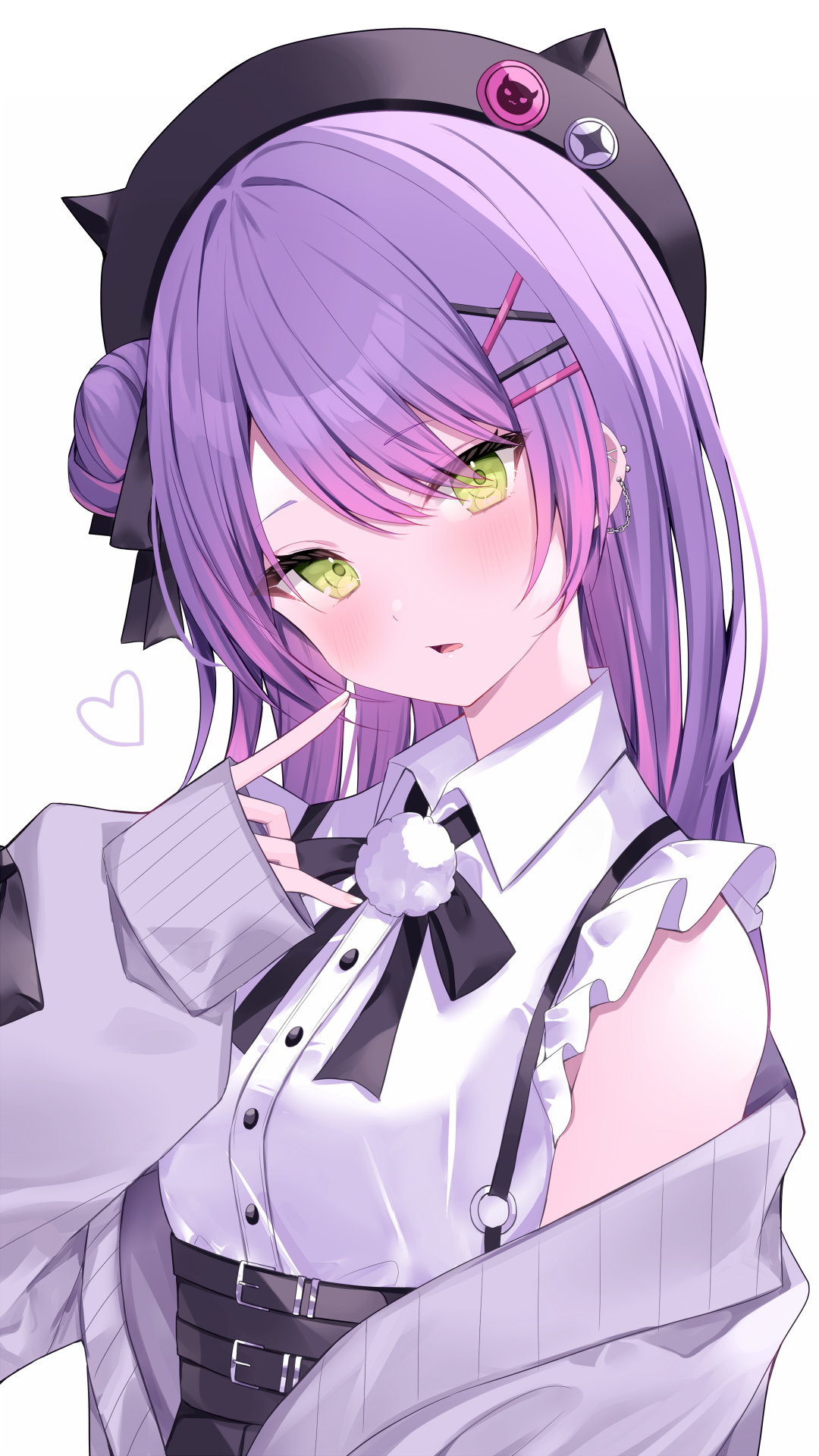 1girl black_ribbon black_skirt blush breasts buttons cardigan collared_shirt colored_inner_hair commentary ear_piercing fake_horns frilled_sleeves frills green_eyes grey_cardigan hair_bun hair_ornament hairclip hat hat_pin heart highres hololive horned_headwear horns jirai_kei long_hair looking_at_viewer maruru_(marurupan) multicolored_hair o-ring official_alternate_costume open_cardigan open_clothes open_mouth piercing pink_hair pointing pointing_at_self pom_pom_(clothes) purple_hair ribbon shirt short_sleeves simple_background single_side_bun skirt sleeves_past_wrists small_breasts solo streaked_hair suspender_skirt suspenders untranslatable_commentary tokoyami_towa tokoyami_towa_(jirai_kei) virtual_youtuber white_background white_shirt x_hair_ornament