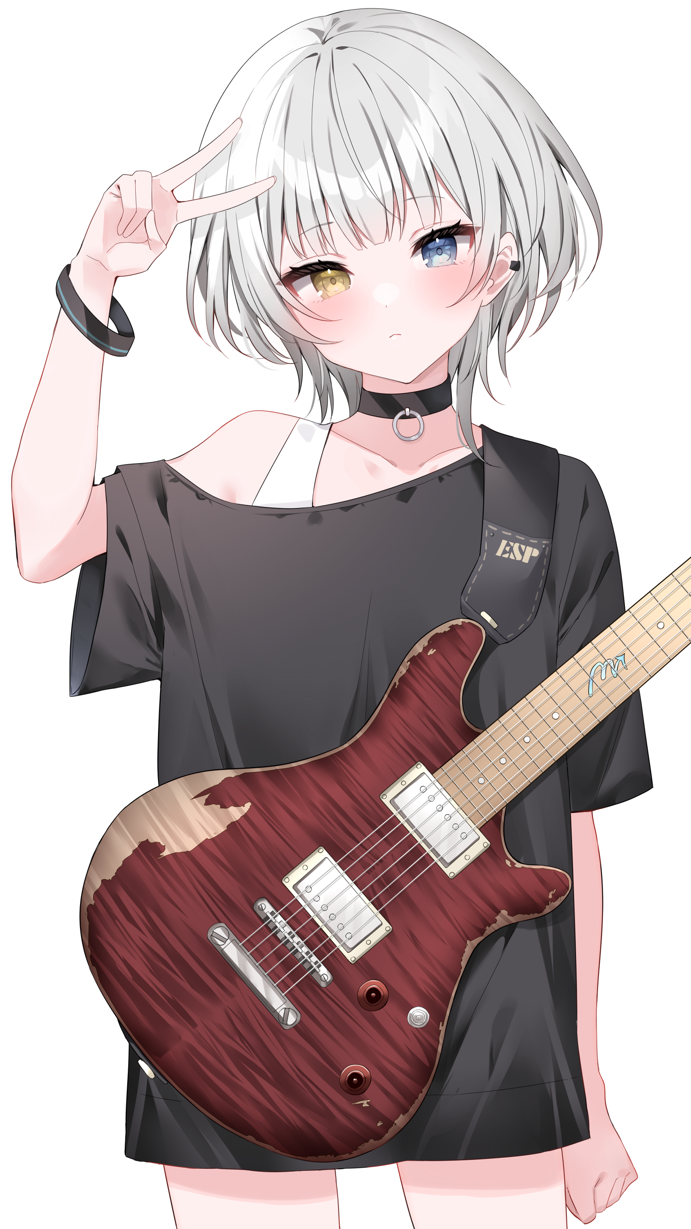 1girl absurdres arm_at_side arm_up bang_dream! bang_dream!_it's_mygo!!!!! black_choker black_shirt blue_eyes blush bracelet choker closed_mouth collarbone commentary cowboy_shot earclip electric_guitar esp_guitars grey_hair guitar guitar_strap heterochromia highres instrument jewelry kaname_raana long_shirt looking_at_viewer maruru_(marurupan) off-shoulder_shirt off_shoulder shirt short_hair simple_background single_bare_shoulder single_off_shoulder solo standing v white_background yellow_eyes