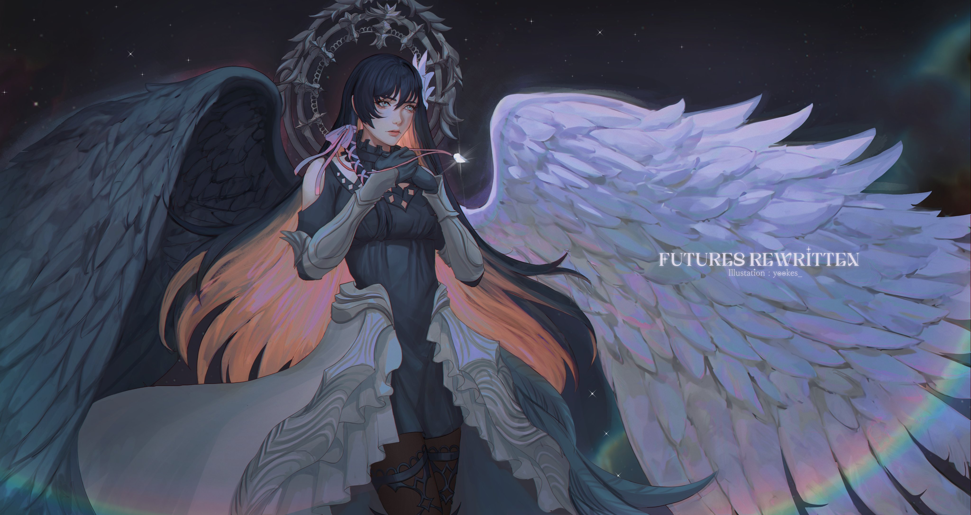 1girl absurdres asymmetrical_wings black_feathers black_hair corruption dark_persona dress feathered_wings feathers final_fantasy final_fantasy_xiv fusion gaia_(ff14) hair_ribbon halo highres jewelry long_hair looking_at_viewer mitron_(ff14) multicolored_hair necklace orange_hair own_hands_together pandora_(ff14) possessed possession ribbon ryne_waters solo square_enix two-tone_hair very_long_hair white_feathers winged_hair_ornament wings yuki_lu